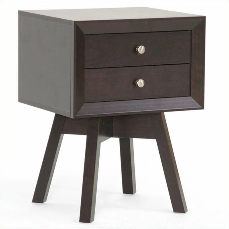 Is a small-sized end table packed with modern details: two drawers, beveled edges, a showstopper of a base, and an overall mid-century modern aesthetic. Dark brown faux wood grain paper veneer finishes off the engineered wood frame. Non-marking feet and silvertone knobs complete the look. Made in Malaysia, this designer end table also serves as a stellar modern nightstand. Assembly is required. To clean, dust with a dry cloth.