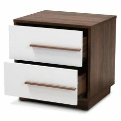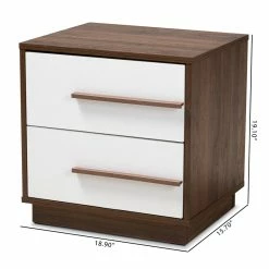 Constructed from engineered wood, Two-tone white and walnut brown finish, Two (2) drawers, Metal drawer glides, Made in Malaysia, Assembly required