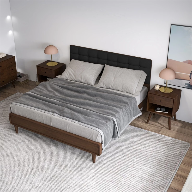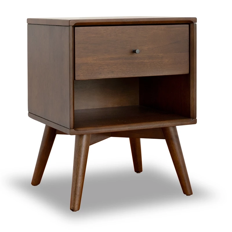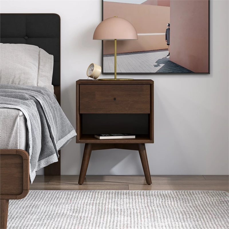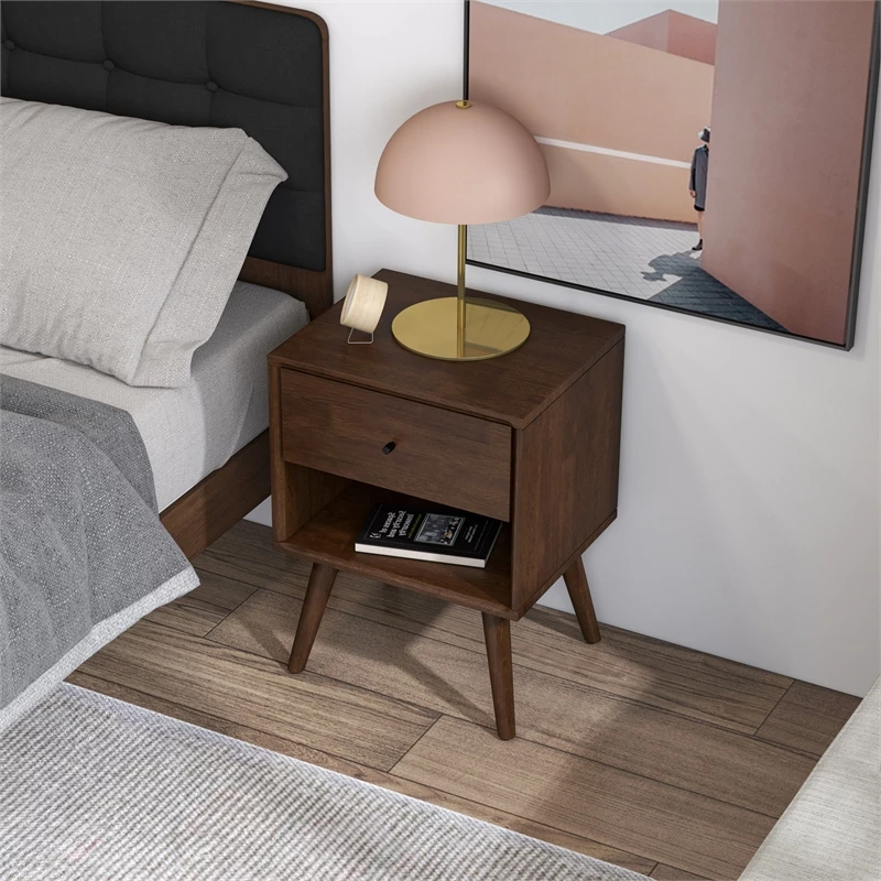 Bedroom furniture accessories complete with Mid-Century Modern furniture style Nightstand. These bedside tables in constructed solid and walnut brown color. As a storage cabinet side table and night stand an eye-catcher for any bedroom or living room. This Vintage Designed Nightstand in brown walnut creates a cozier, elegant living space. Solid wood crafted beveled edges and decorative knobs easy to blend to your living room, attic bedroom, guest room, lounge, study room, office, kids room, game room and etc. Thanks to its classy design and convenience this nightstand can be used as bedroom nightstand set of 2 or a single on the bed side table/night. It is Multifunction End Table, Walnut nightstand with drawers is designed for small spaces. This brown small nightstand also good to work as sofa end table, side table, corner table, file cabinet, extend storage table besides bedroom dresser, console table. Drawer slides open large to provide bedside shelf and organizer and storage table. This compact size modern nightstand can be used in condo, loft, house and apartment bedrooms. Built from durable solid wood shelf frame and the legs guarantee enough stability and safety. Materials are humidity resistant and easy wet wipe cleaning. Product comes as semi assembled; very minimal only feet assembly required. All nightstands in stock and ships in 3 days with available fastest cargo.