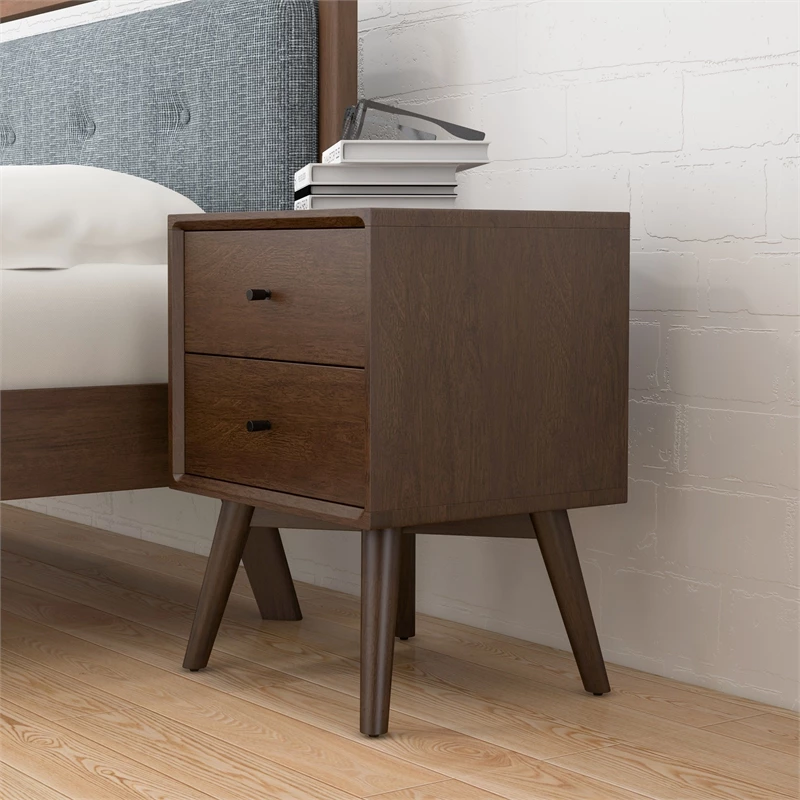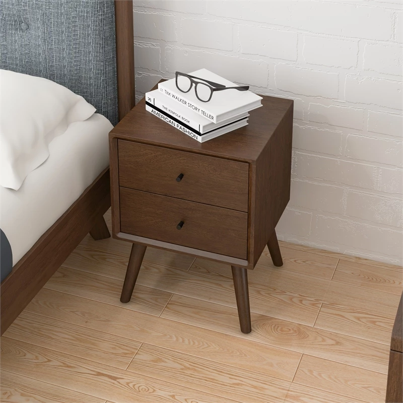 Bedroom furniture accessories complete with Mid-Century Modern furniture style Nightstand. These bedside tables in constructed solid and walnut brown color. As a storage cabinet side table and night stand an eye-catcher for any bedroom or living room. This Vintage Designed Nightstand in brown walnut creates a cozier, elegant living space. Solid wood crafted beveled edges and decorative knobs easy to blend to your living room, attic bedroom, guest room, lounge, study room, office, kids room, game room and etc. Thanks to its classy design and convenience this nightstand can be used as bedroom nightstand set of 2 or a single on the bed side table/night. It is Multifunction End Table, Walnut nightstand with drawers is designed for small spaces. This brown small nightstand also good to work as sofa end table, side table, corner table, file cabinet, extend storage table besides bedroom dresser, console table. Drawer slides open large to provide bedside shelf and organizer and storage table. This compact size modern nightstand can be used in condo, loft, house and apartment bedrooms. Built from durable solid wood shelf frame and the legs guarantee enough stability and safety. Materials are humidity resistant and easy wet wipe cleaning. Product comes as semi assembled; very minimal only feet assembly required. All nightstands in stock and ships in 3 days with available fastest cargo.