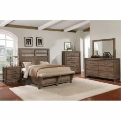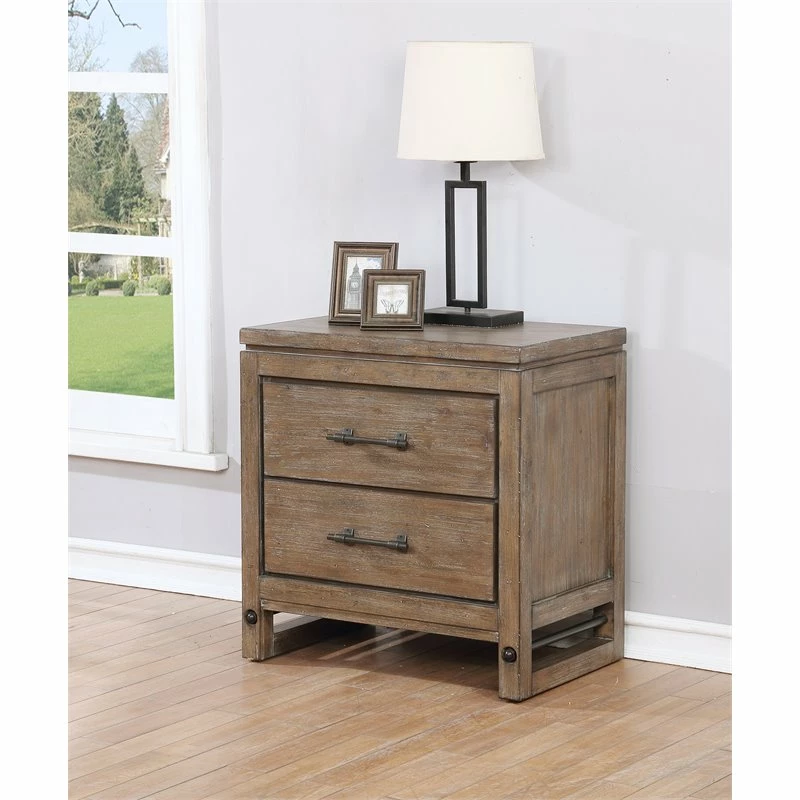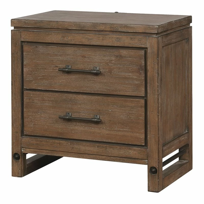Come relax in style and comfort with Round Rock. The design and function of the upholstered bench footboard is a must for any bedroom. This rustic bedroom case pieces have a live edge with bolt heads to give style to the collection. The top felt lined drawers and cedar bottom drawers are added features to help keep your treasured items safety and naturally repulse insects. Need extra USB charging ports? The nightstand is the fit for you. The nightstand features double USB ports on the back and a night light on the bottom.