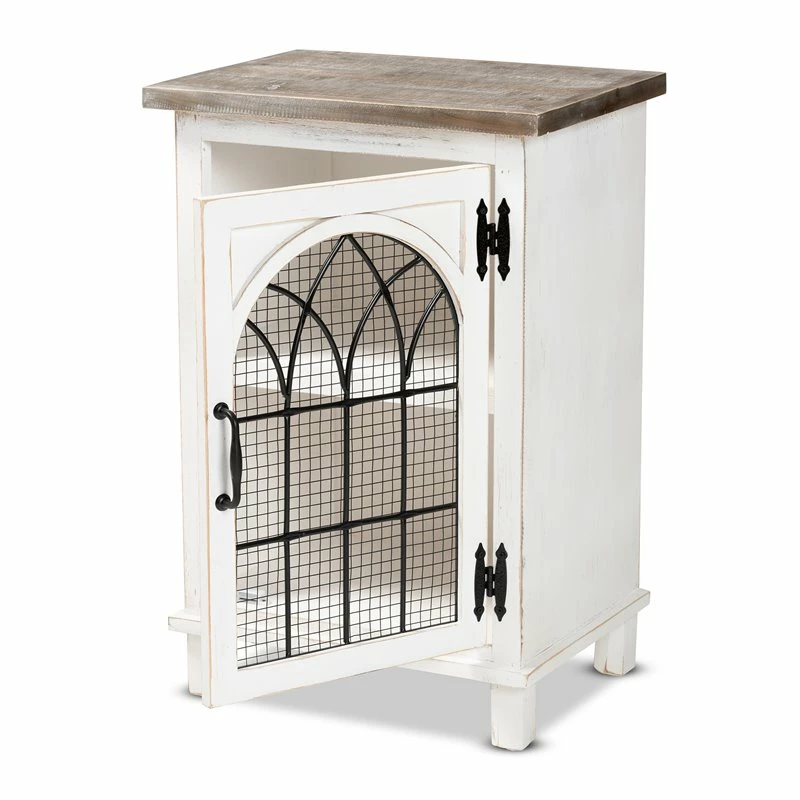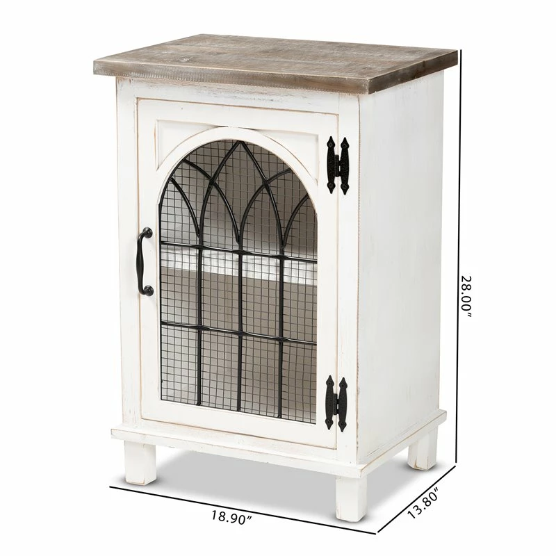 Bedroom organization is made easy with the charming Faron nightstand. Made in China, the Faron is comprised of a sturdy wood frame featuring a lightly weathered two-tone white and oak brown finish for an aged, vintage look. Two shelves behind the door provide ample space to organize bedside essentials, while the tabletop lends space for daily use. Fully assembled, the Faron is adorned with antique inspired, black finished metal accents for a cool, industrial touch. A fantastic assistant to the modern household, the Faron nightstand adds value to any space.