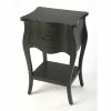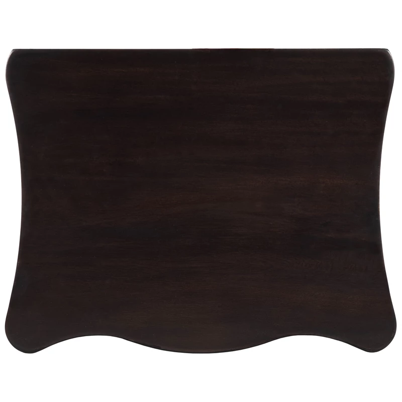 Crafted from mahogany veneer and wood products in a stylish and dramatic wood finish, this nightstand is perfect for stowing bedside essentials. This lovely nightstand showcases a single drawer with iron hardware, a scalloped apron and lower display shelf.