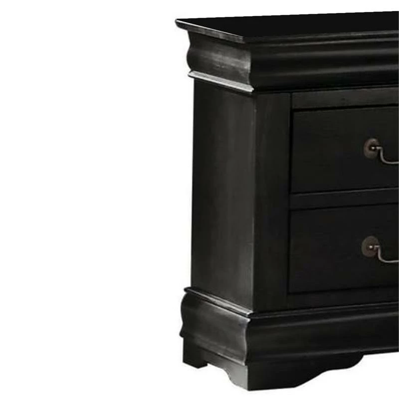 This nightstand’s vintage inspired details add storage with traditional appeal to any bedroom space. Constructed of select veneers and hardwood solids in a black finish, the spacious nightstand offers two drawers for you to store your reading books, reading glasses, and other belongings at an arms length away when you are in bed. Complete with shaped molding, bracket feet, and antique bronze color bail hardware, the nightstand has relaxed yet timeless style. Note: other featured items in image except this nightstand are sold separately.