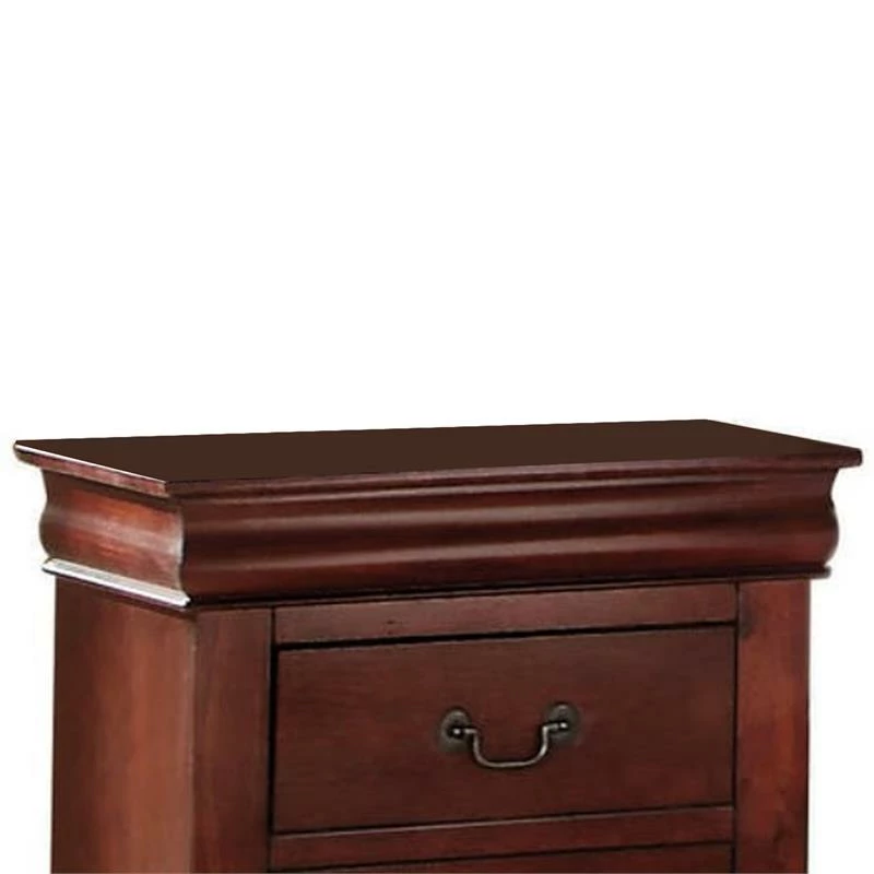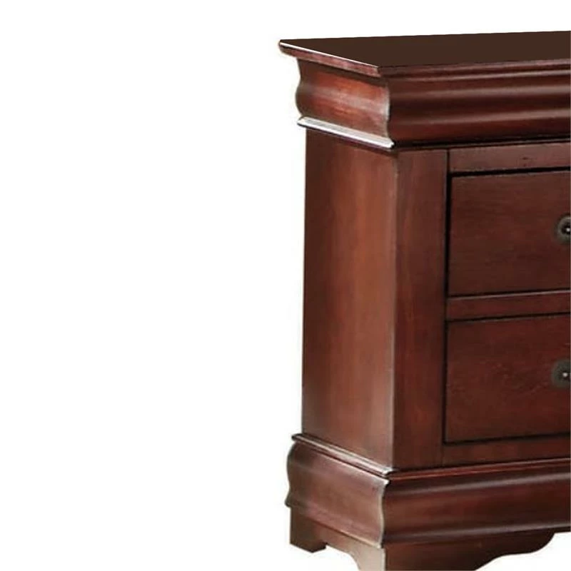 This nightstand’s vintage inspired details add storage with traditional appeal to any bedroom space. Constructed of select veneers and hardwood solids in a cherry brown finish, the spacious nightstand offers two drawers for you to store your reading books, reading glasses, and other belongings at an arms length away when you are in bed. Complete with shaped molding, bracket feet, and antique bronze color bail hardware, the nightstand has relaxed yet timeless style. Note: other featured items in image except this nightstand are sold separately.