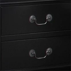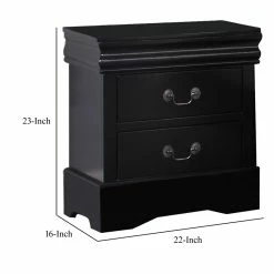 Timeless transitional style meets exquisite molded design with this expertly crafted nightstand. Featuring two smooth gliding drawers, it is made from durable solid and composite wood in a striking black finish. The antique style silver polished handles add character, while the chiseled design of the aprons complete its stylish, classical look. Check out our Liam collection to complete the set.