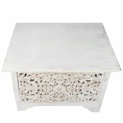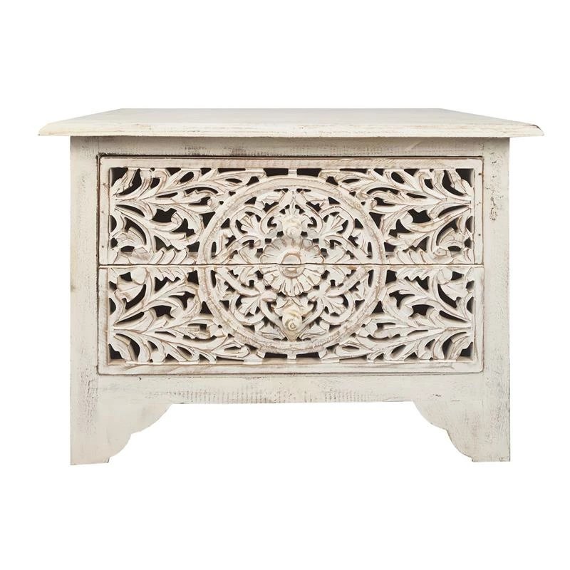 Exquisitely designed with quality and style in mind, this gorgeous accent table or a nightstand is sure to add class and charm to any interior decor. It has two smooth gliding drawers to keep your essentials organized, and the spacious rectangular top offers plenty of space for table lamps, books, and phone chargers. The intricate floral cut out design along the drawer panels, carved from the sturdy mango wood frame in an antique white finish, makes for a stunning accent piece. This versatile piece of furniture can also be used in the living room as a side table or end table. Check out our Olta collection for matching pieces.