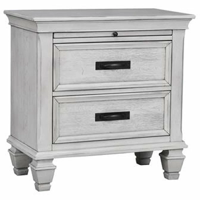 This Two-Drawer Nightstand in Antique White is chock full of features to help with your nighttime routine.