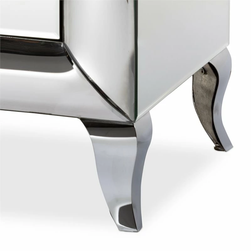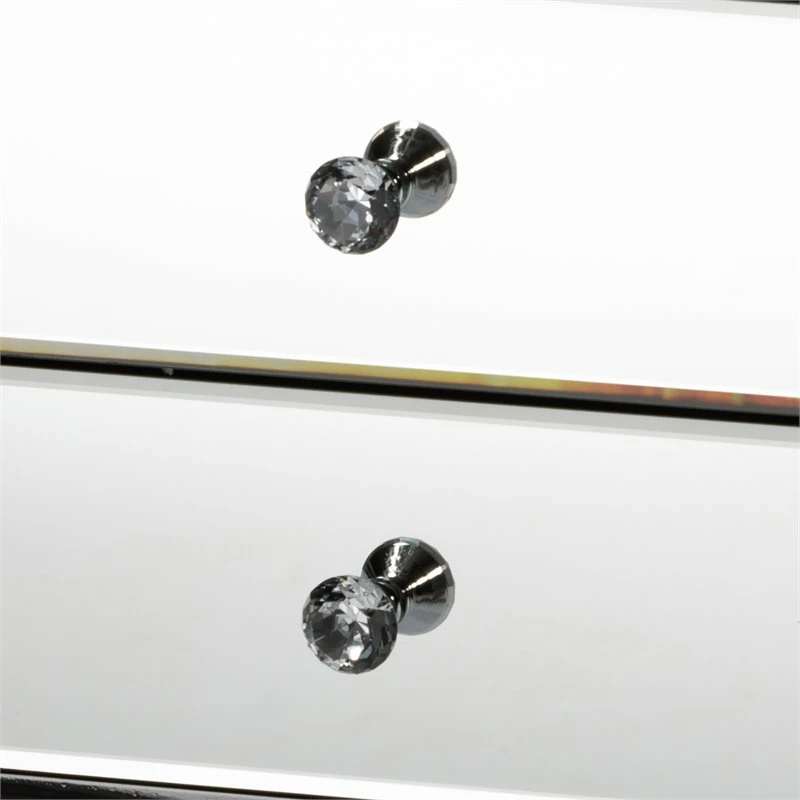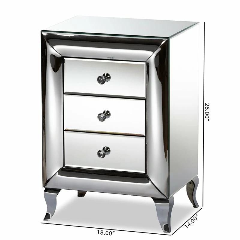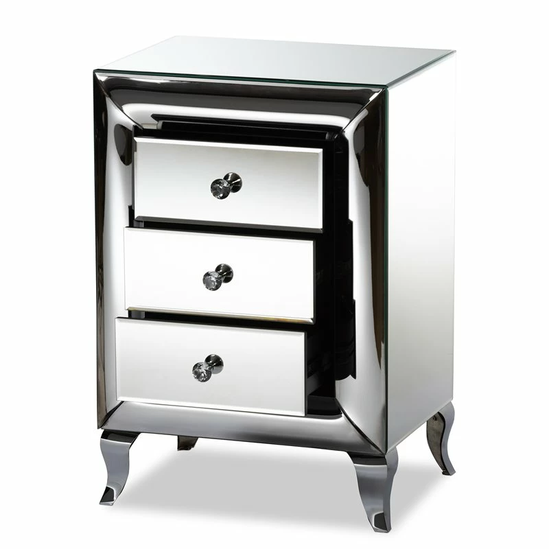 Compact yet graceful, the Bowery Hill nightstand adds a luxurious statement to any bedroom. Made in China, the nightstand is comprised of a wood frame encased in stunning mirrors for a glitzy aesthetic from any angle. Three drawers provide convenient storage for all your bedside essentials. Fully assembled, the drawers are accented with stunning crystal knobs for added glamour. Light easily reflects off all surfaces of the nightstand, making it a dazzling addition to any space.
