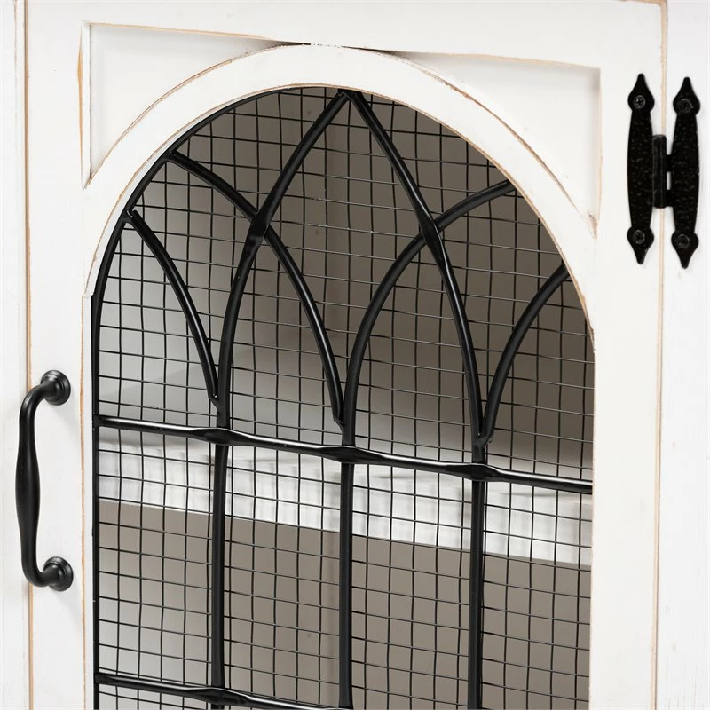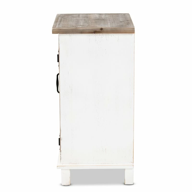Bedroom organization is made easy with the charming nightstand. Made in China, the nightstand is comprised of a sturdy wood frame featuring a lightly weathered two-tone white and oak brown finish for an aged, vintage look. Two shelves behind the door provide ample space to organize bedside essentials, while the tabletop lends space for daily use. Fully assembled, the nightstand is adorned with antique inspired, black finished metal accents for a cool, industrial touch. A fantastic assistant to the modern household, the nightstand adds value to any space.