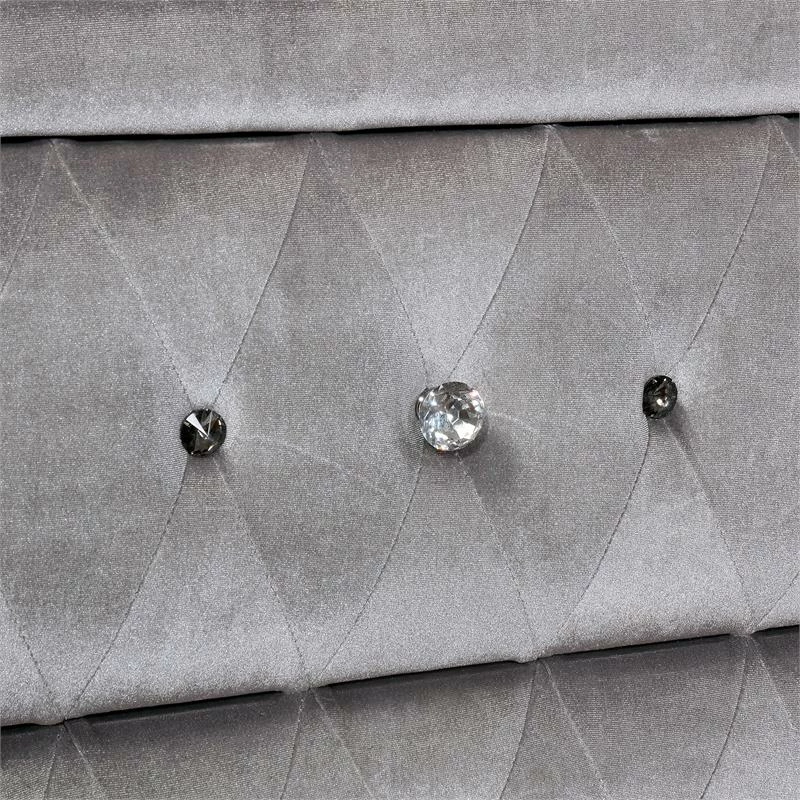 Glamorize your room with the Fabric Nightstand in gray by Bowery Hill. Nailhead trim glamorously frames the design as acrylic tufts and diamond stitching deliver stunning accentuation. Upheld by lovely carved tapered legs, the Bowery Hill Nightstand ensures a sturdy and stable foundation.