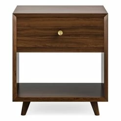 Mid-century styling meets modern convenience with this elegant nightstand designed to store your bedside essentials. Outfitted with a roomy, felt-lined top drawer and an open lower shelf, the Ludwig open nightstand also features integrated power to keep unsightly cords neatly concealed. A warm walnut finish accented with brushed brass drawer pulls lends timeless sophistication. Splayed, tapered legs and chamfered frame edges create an iconic silhouette that seamlessly coordinates with the different Ludwig bed styles.