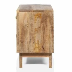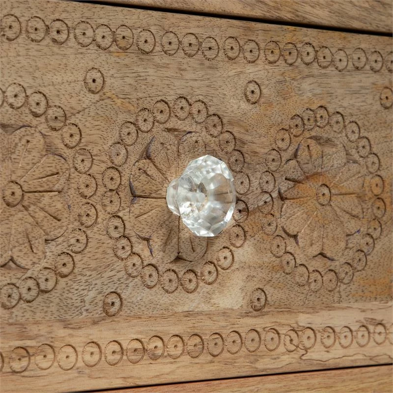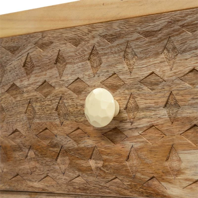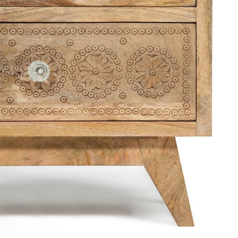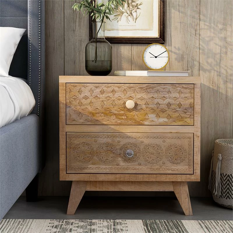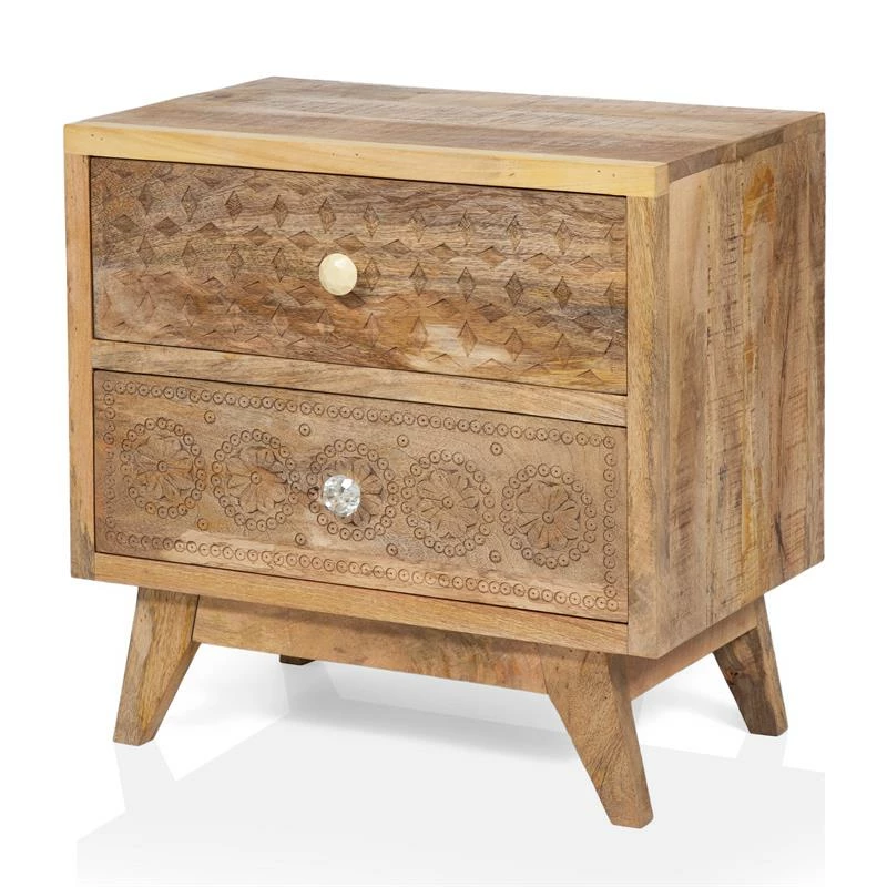 Bohemian drawer fronts and rough hewn wood surfaces create a vintage aura for this rustic nightstand. It’s made from solid mango wood with warm undertones, and offers a natural finish that adds to its intriguing combination of rugged and refined details. Two drawers each features a different drawer front design and knob, creating a visually intriguing presentation rich in functionality as the drawers offer storage at the bedside.