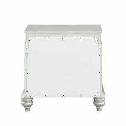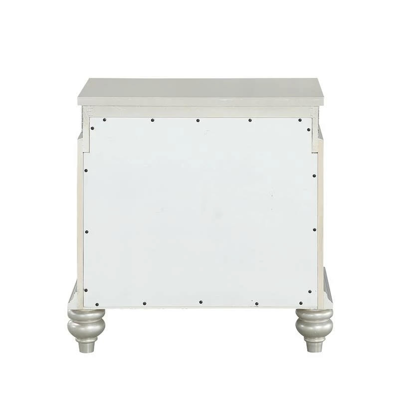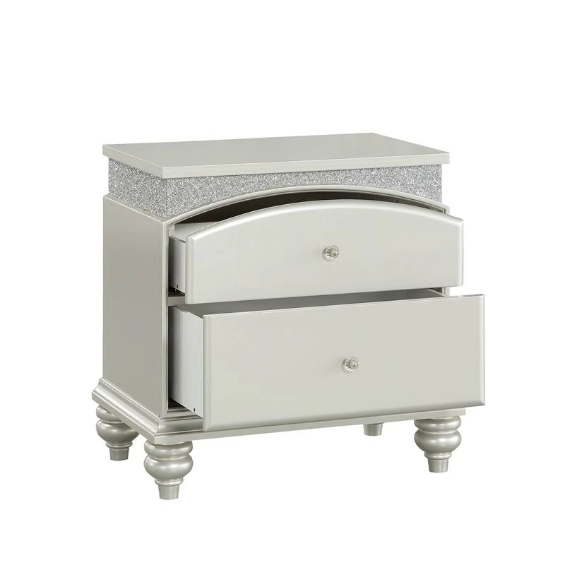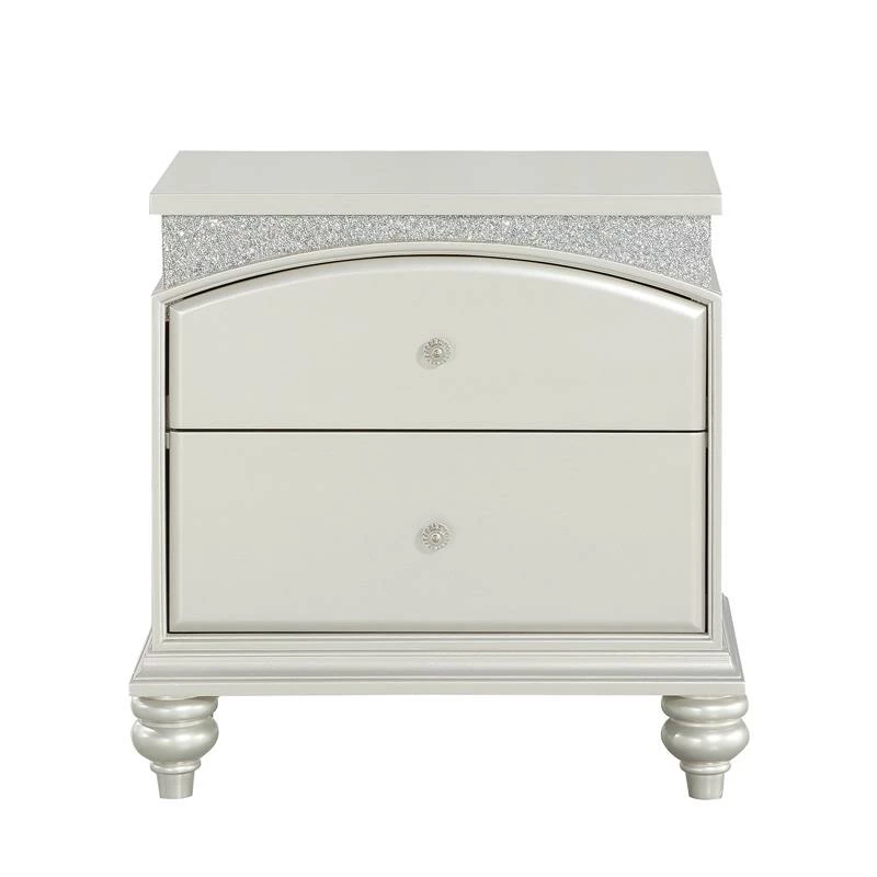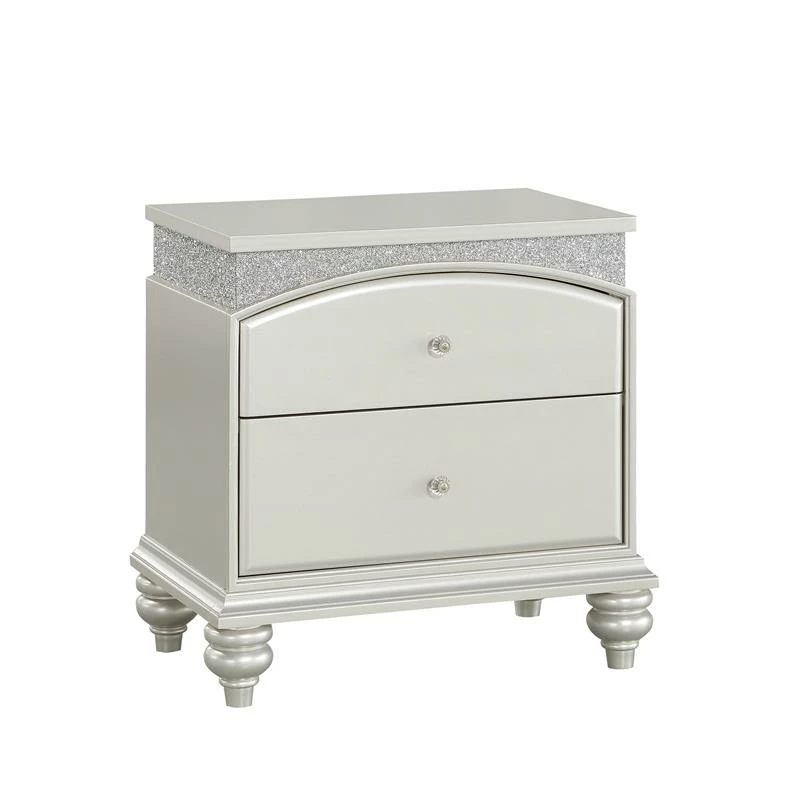 Style your bedroom with this Bowery Hill 2-Drawer Nightstand for a hint of glamor and upscale appeal. It immediately draws your eyes with its arch-shaped top drawer, crystal-like accents, and platinum-finished wood bun legs. Its French-dovetail front drawers are crafted for durability and are spacious enough for all of your bedside essentials.