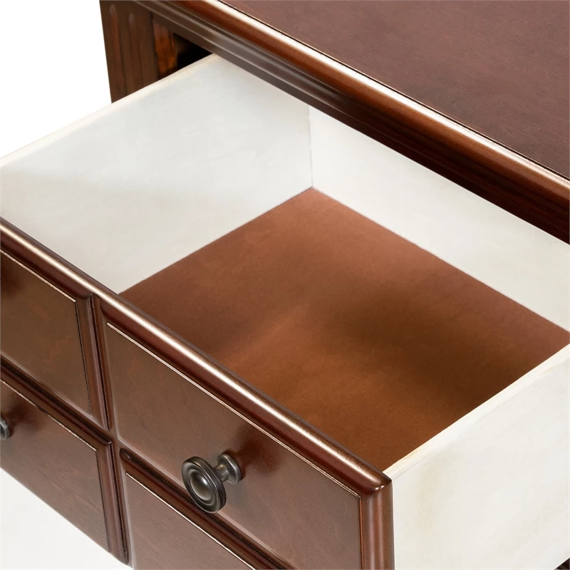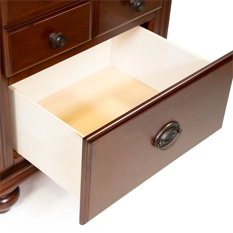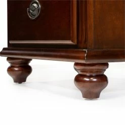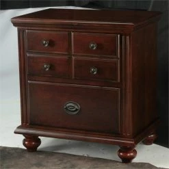 The classic design of the wood nightstand is elegant and functional. Store away bedside essentials, delicates, jewelry within the two storage drawers. The decorative handles and solid wood bun feet accentuate the European style while the cherry finish warms up your space.