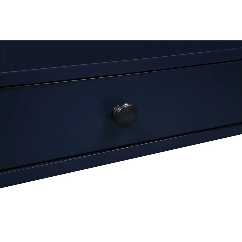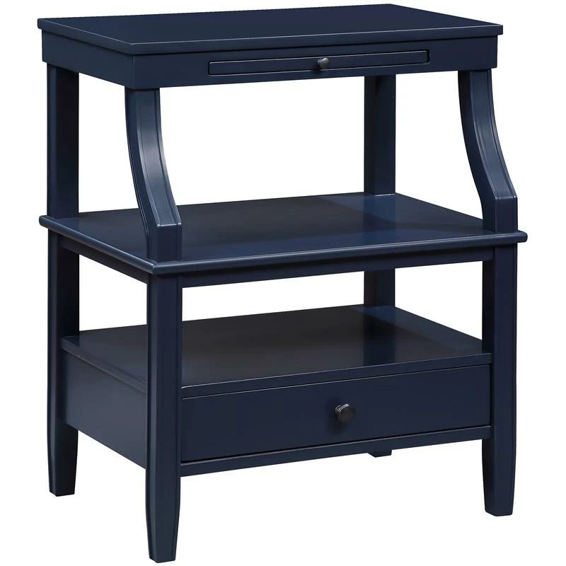 Featuring classic black hardware, on a rich midnight blue finish, the Midnight Blue Storage Nightstand offers warm, inviting elegance for any decor. The spacious shelves, drawer and pull out drink tray provide convenient storage space.