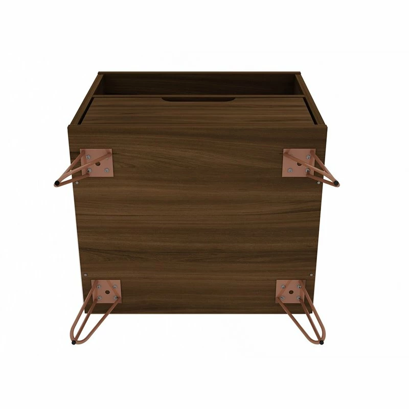 Moonlighting as an end table or armchair sidekick, the Eden Home nightstand is seamless and sophisticated, with plenty of Mid-century flair, enhanced by edgy metal splayed legs, cutout drawer handles, and clean lines, to feature one sophisticated design. Tuck away remotes, books, tablets, and more, in the concealed drawer space, and keep magazines, laptops, or books, in the open shelf space for easy access. Add a decorative lamp and favorite framed photos on its base and set it in the living room or bedroom to finish off the space.