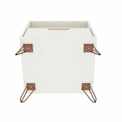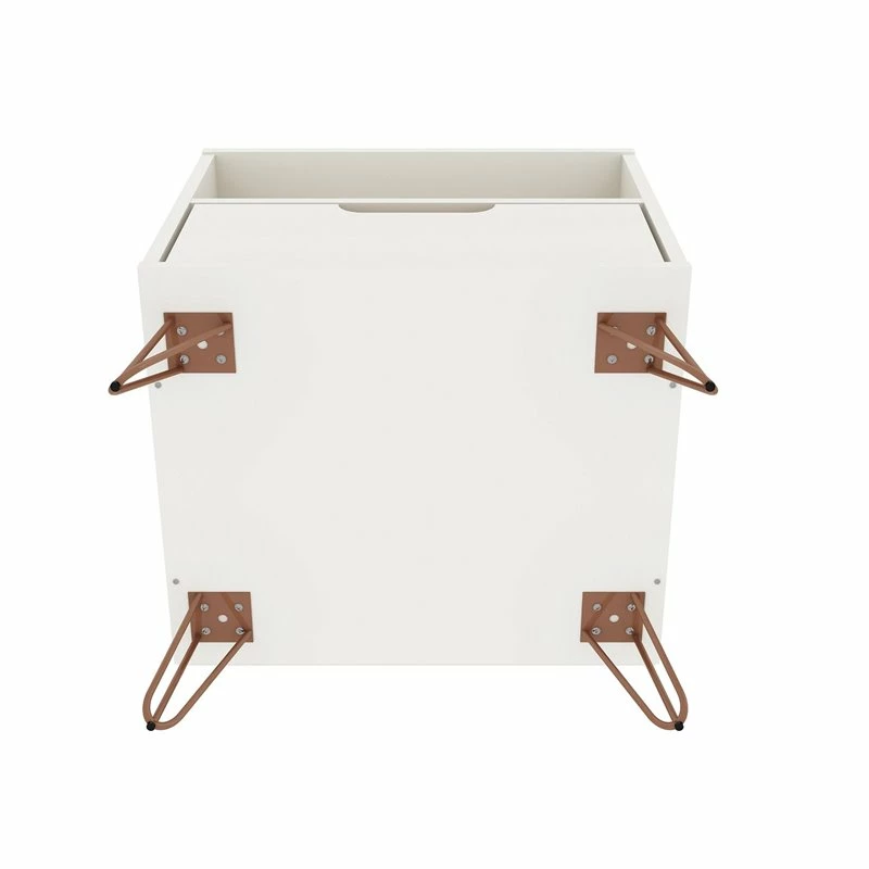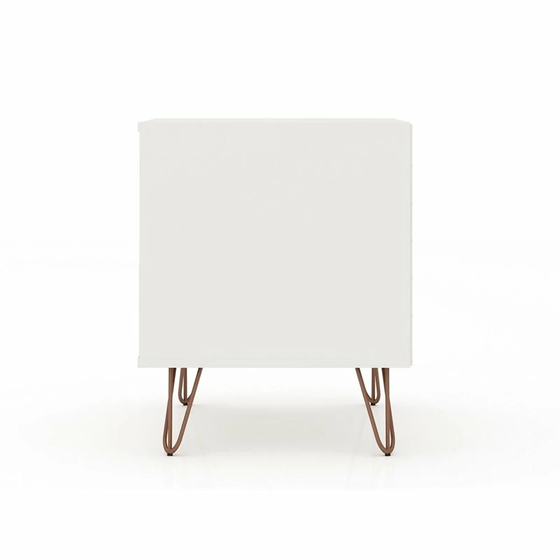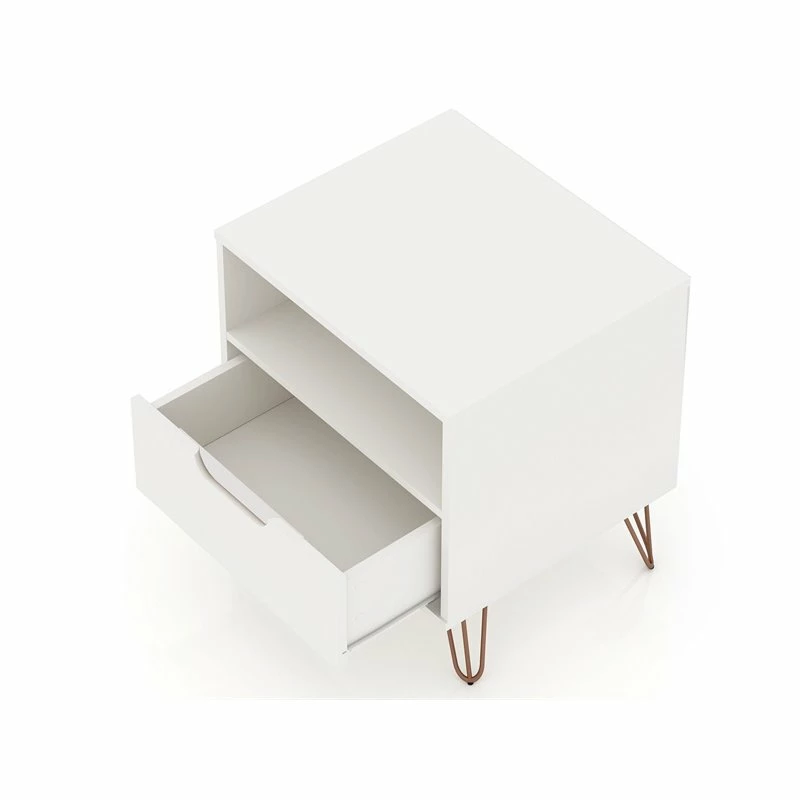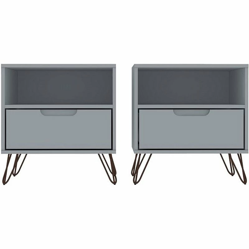 Moonlighting as an end table or armchair sidekick, the Eden Home nightstand is seamless and sophisticated, with plenty of Mid-century flair, enhanced by edgy metal splayed legs, cutout drawer handles, and clean lines, to feature one sophisticated design. Tuck away remotes, books, tablets, and more, in the concealed drawer space, and keep magazines, laptops, or books, in the open shelf space for easy access. Add a decorative lamp and favorite framed photos on its base and set it in the living room or bedroom to finish off the space.