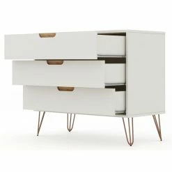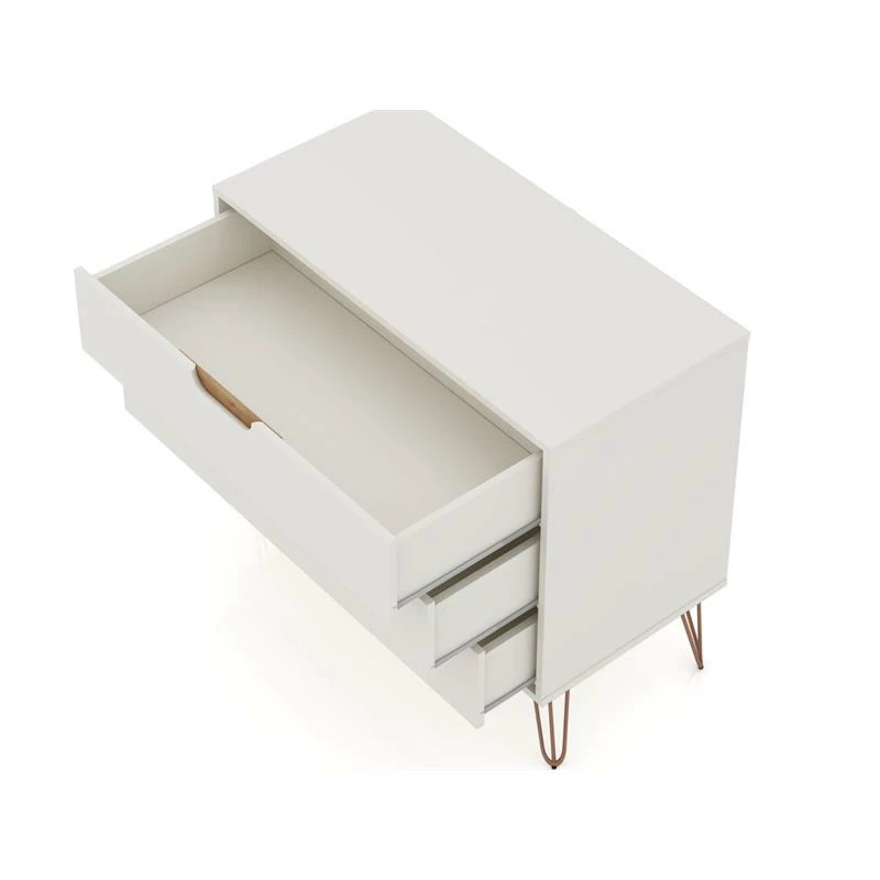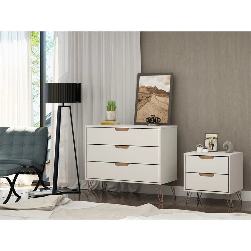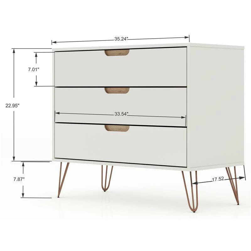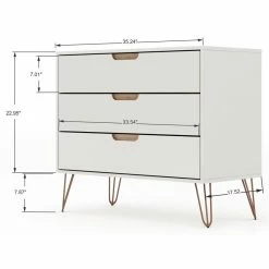 The Eden Home dresser and nightstand is the perfect accompaniment to any bedroom space, with ample storage and minimalistic Mid-century modern style. Cutout handles keep the piece feeling fresh with three drawers made easy for stowing away clothing, personal items, and beyond. A display top allows for sharing favorite framed family photos, travel trinkets, perfume trays, or a decorative lamp. Set it under a mirror or painting to complete your space with this instant bedroom focal point.