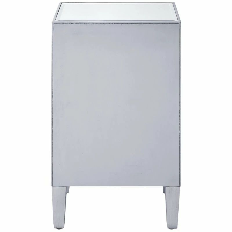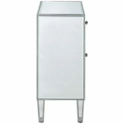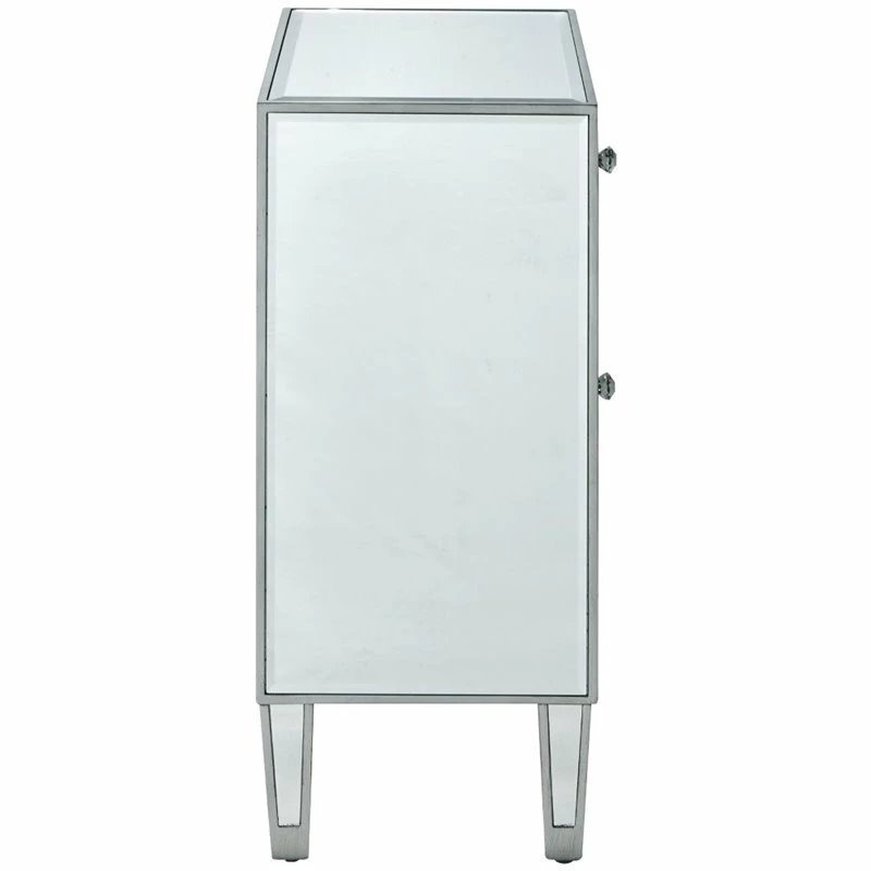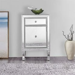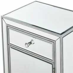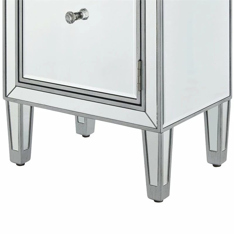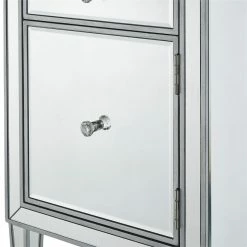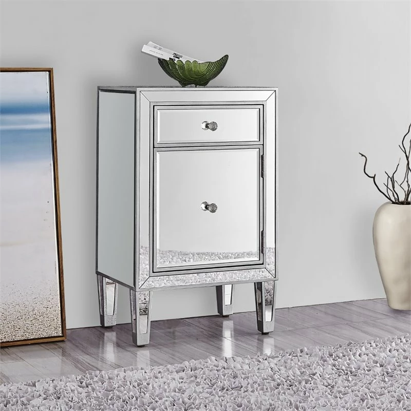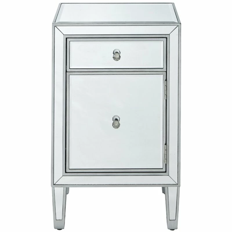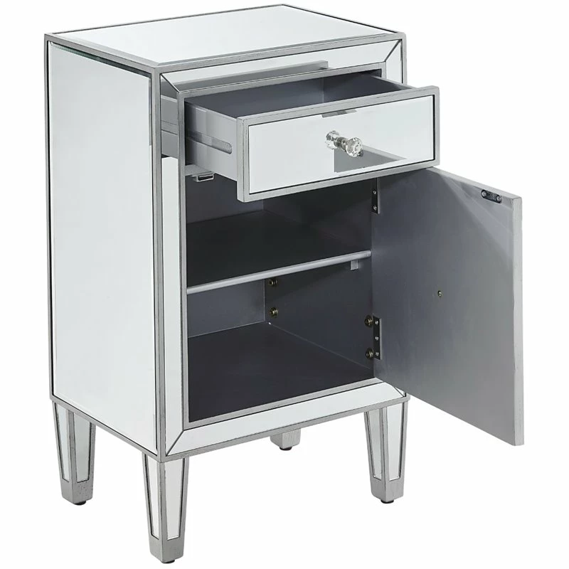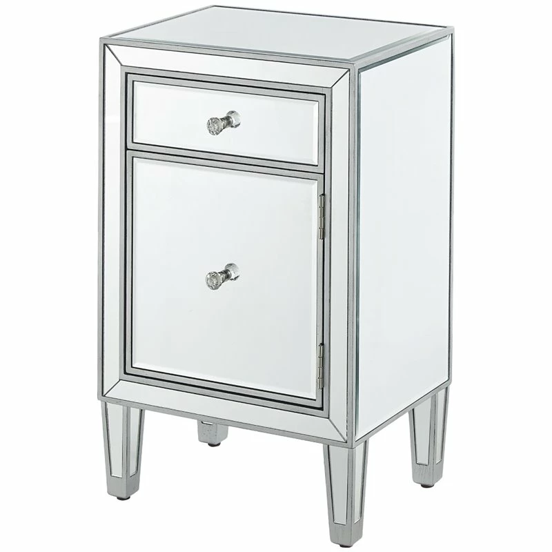 Add a touch of class to your bedroom or any room with this stunning accent chest. With beaming mirrored surfaces, it opens up the visual space in the room while imbuing it with glamour. This functional contemporary chest comes with one drawer, one door, sparkling crystal knob, and gracefully tapered legs.