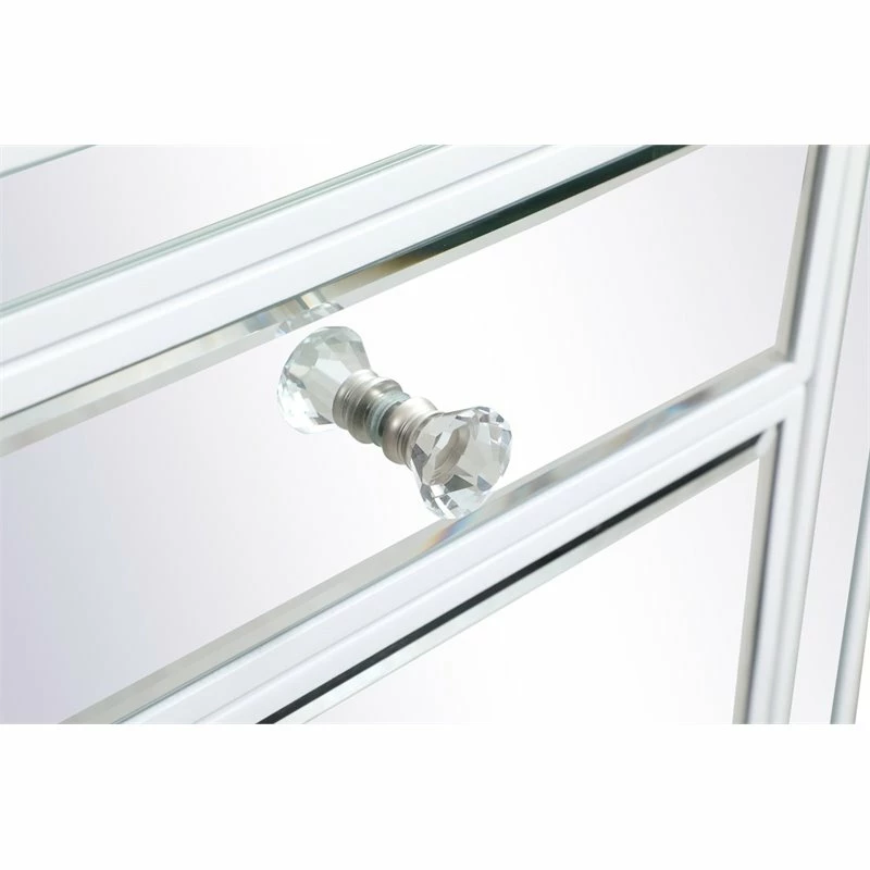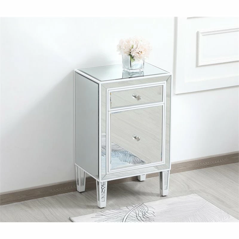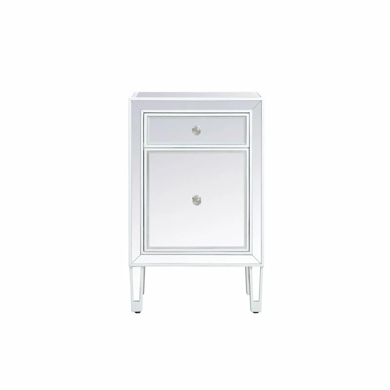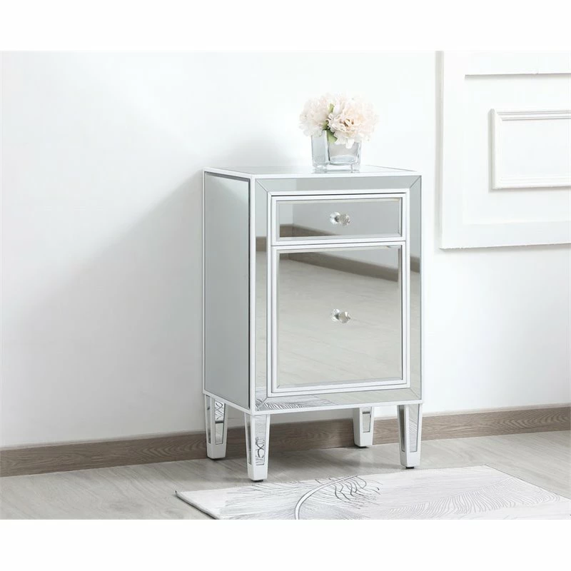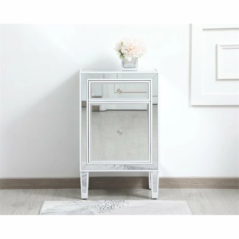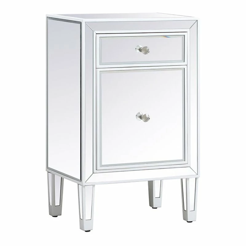 Add a touch of class to your bedroom or any room with this stunning accent chest or nightstand. With beaming mirrored surfaces, it opens up the visual space in the room while imbuing it with glamour. This functional contemporary chest comes with one drawer, one door, sparkling crystal knob, and gracefully tapered legs.