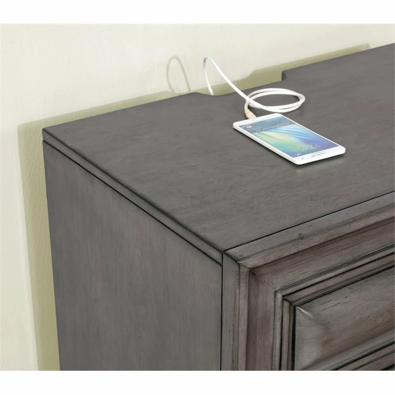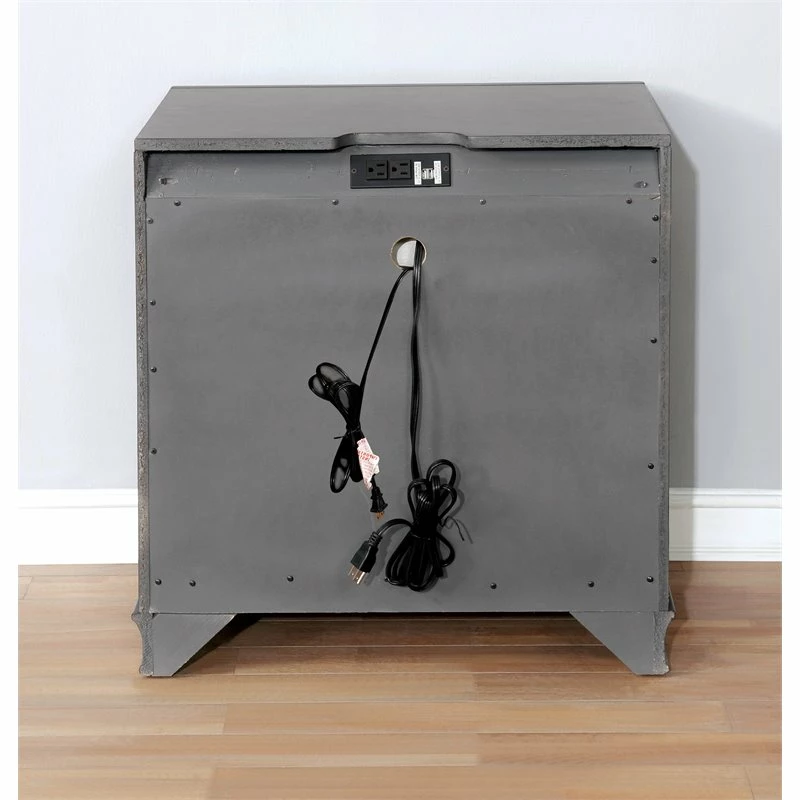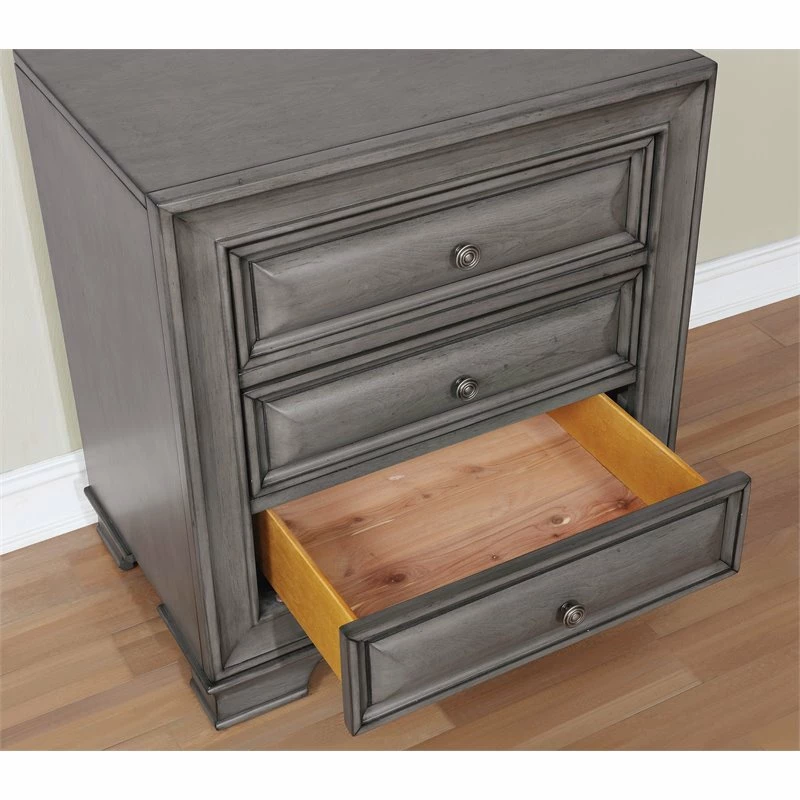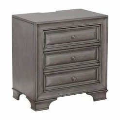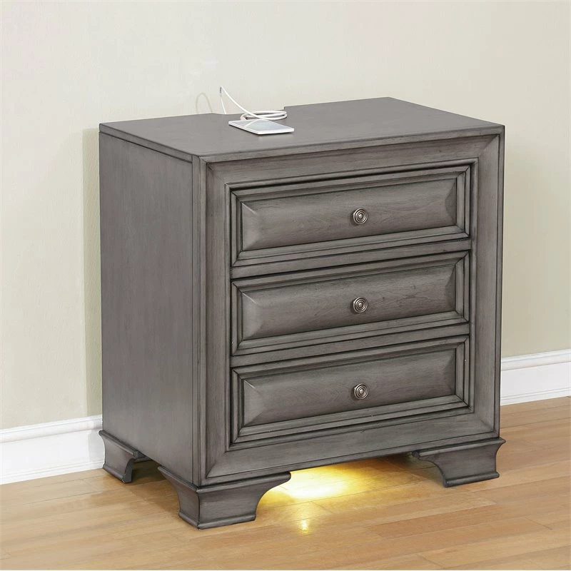 This Nightstand features gorgeous paneled drawers and a sophisticated gray finish. Each drawer offers ample storage for your bedside essentials while the felt lined top drawer allows you to easily store jewelry and other fragile items. Conveniently charge devices from the comfort of your bed with the nightstand’s dual USB ports and power outlets. Functional and timeless, This Nightstand completes any modern bedroom. Crafted from solid wood and wood veneers for stability and durability.