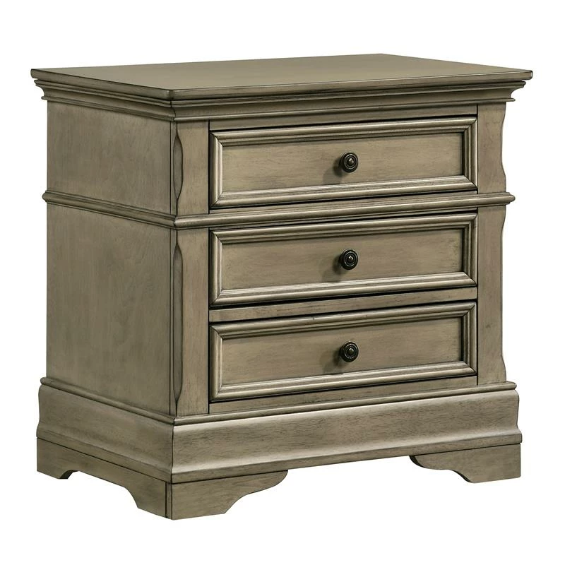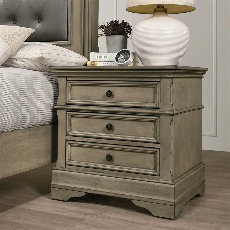 Rustic finishes bring an accessible, inviting look to this traditional solid wood three-drawer nightstand. A gorgeous addition in your elegant bedroom, it boasts a lovely antique warm gray finish paired with classical trim molding and carved details that create the illusion of old world columns. The drawers add bedside storage and are accented with round knobs for easy, stylish access. Bracket feet complete this exceptional design.