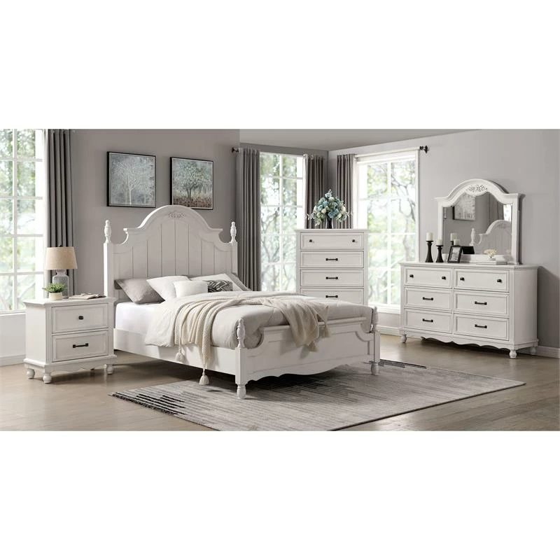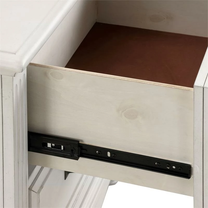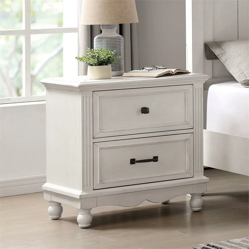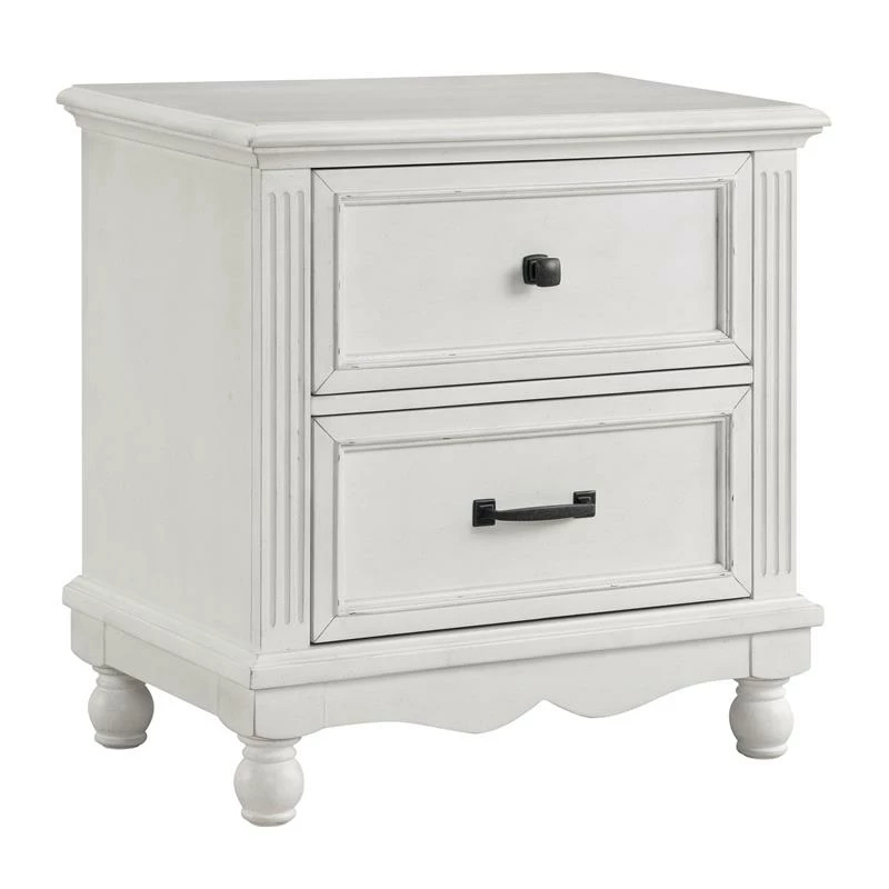 Suffused with cottage inspired character, this charming solid wood two-drawer nightstand brings a classical look and feel to your bedside. Beautiful in an antique white finish, the nightstand is adorned with fluted column details and is complete with a shaped apron that adds movement and energy. Drawers feature a mix of square and bar pulls, and a USB port and power outlet add modern convenience you’ll love.