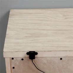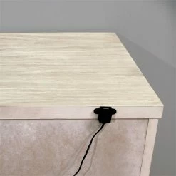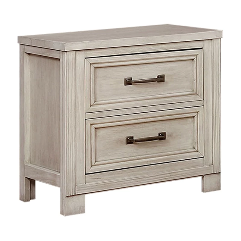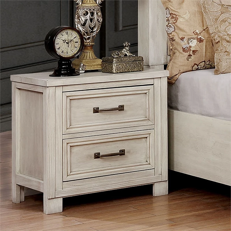 Keep your bedroom organized and clutter-free with this 2-drawer nightstand, finished in an antique white color. Each drawer is constructed with an English dovetail design for durability and runs on smooth, ball bearing metal glides. For a more modern appeal, a USB outlet is included within the back of the stand. The natural wood grain finish gives this piece its transitional appearance that can be paired with various bedroom pieces.