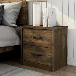 Embrace simplicity with the roomy storage and clean silhouette of this two-drawer nightstand. Perfect for bedside storage, it features a warm brown walnut wood finish complete with engaging wood grain details that bring rustic charm to your space. Two drawers are finished with black metal bar pulls, adding a hint of contrast. Add a rustic reading lamp or a beautiful candleholder to complete the look.