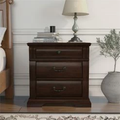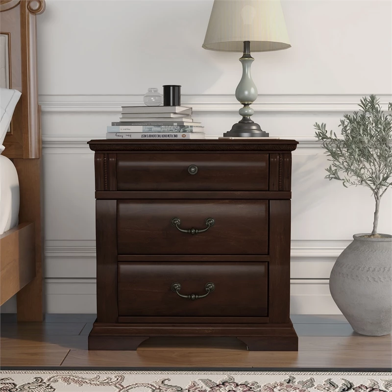 Lavishly complement your bed with the Transitional Oulette Three Drawer Nightstand. Sculpted with intricate wood carvings, detailed with antique style handles and smoothly rounded along the three spacious drawers the piece showcases expert craftsmanship. Use the generous storage to stow bedside essentials like night creams, books, chargers and more while the top surface houses a lamp, framed pictures and décor. Sturdy tapered legs and solid wooden construction ensure long term durability and the Cherry finish offers rich reddish brown tones. Update with the luxuriously refined Oulette Nightstand.