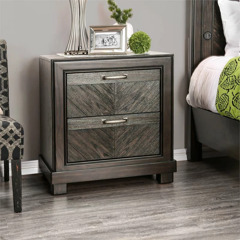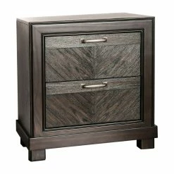 The Reauso Nightstand, crafted from solid wood and wood veneers, features a sophisticated plank arrow design and clean modern frame. Easily store essentials in generous English dovetail drawers while polished handles accent the rich espresso finish and add stylish touches to the design. With ample room for decor the Reauso Nightstand is an easy choice for modern or transitional homes.