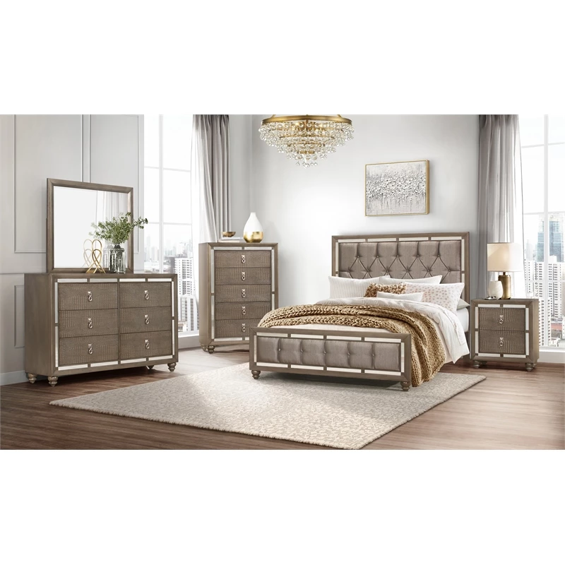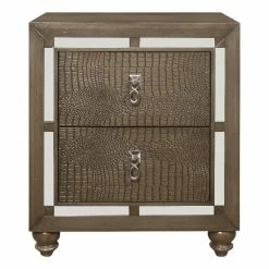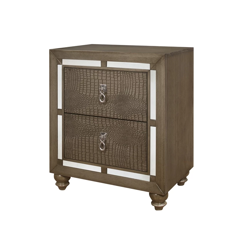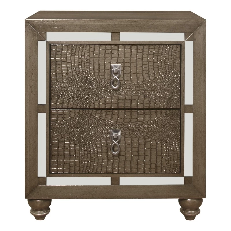 Shown here is the delightful Ivy nightstand, sure to create a charming, elegant look for your sleeping area. This contemporary nightstand has sleek styling and pleasing accents and the enchanting silver champagne tone with mirror trim accent make coordinating room décor easy and stress-free. This nightstand is spacious, and has silver-toned knocker style Drawer front hardware and bun style feet complement the overall design and contribute to the lovely and sophisticated appearance of this furniture. Quality craftsmanship in every facet of production ensures durability and long-lasting wear. Create the inviting bedroom setting of your dreams by choosing the Ivy nightstand and watch your bedroom area become a haven of comfort and relaxation for your home for years to come.
