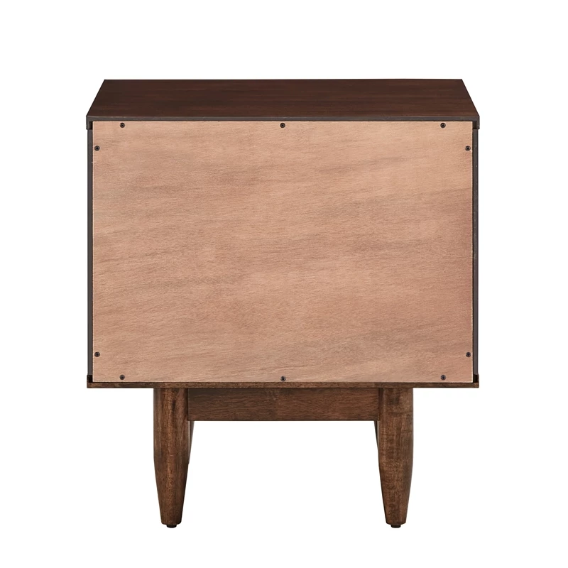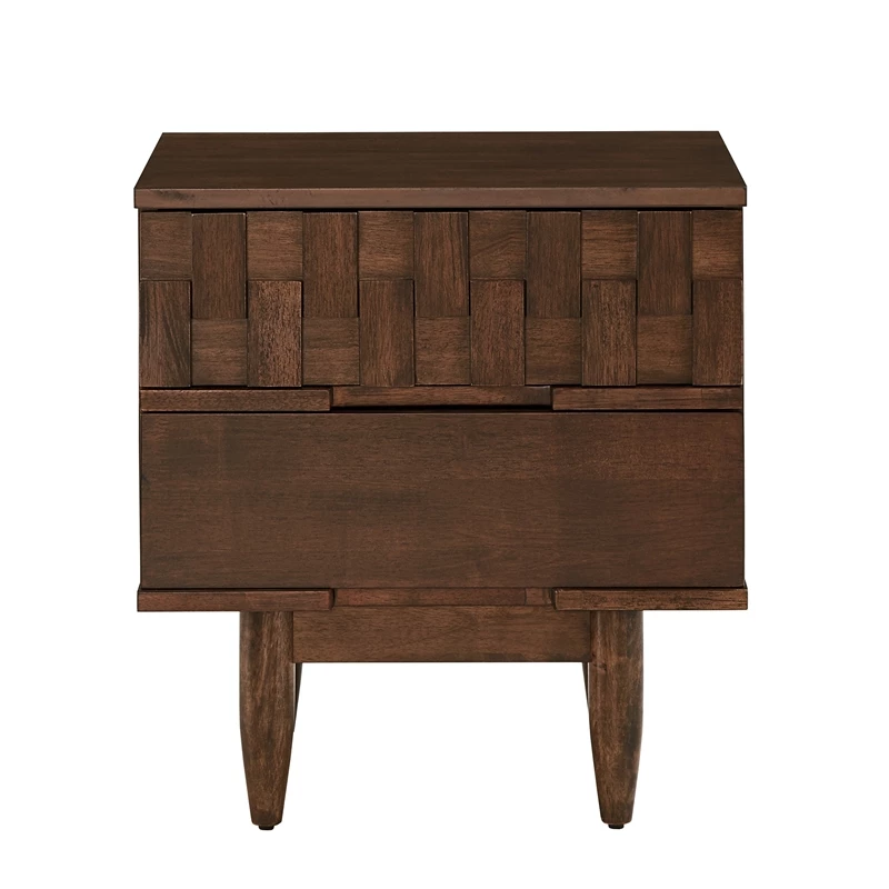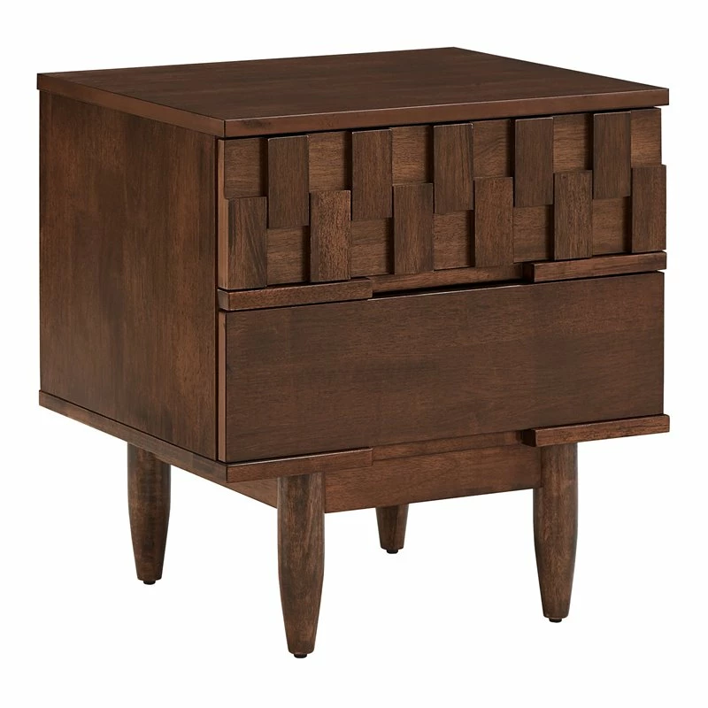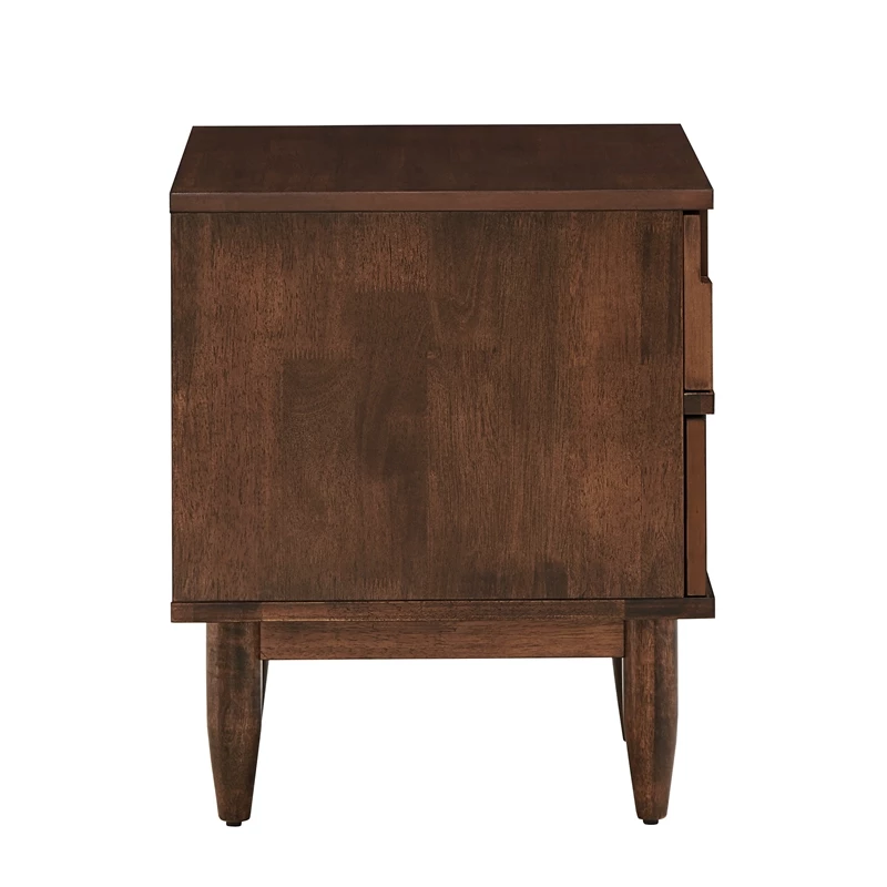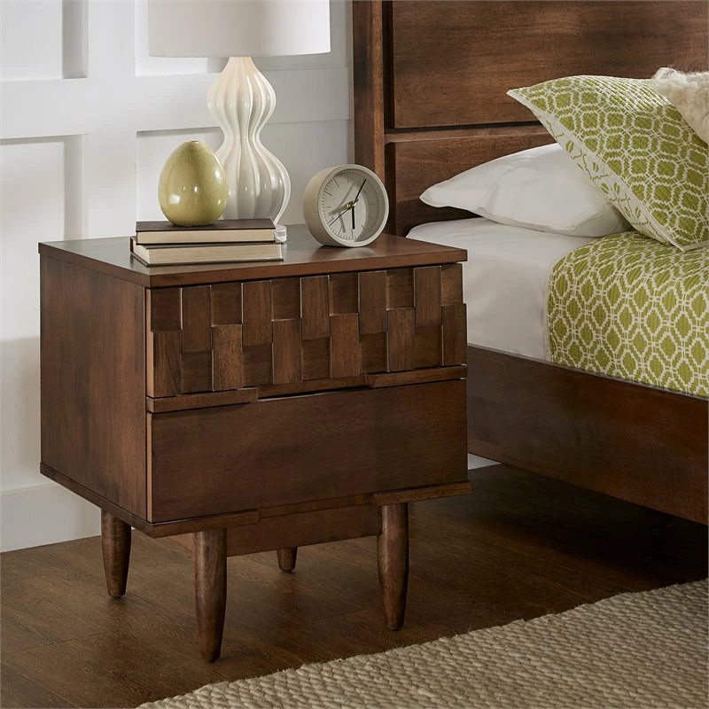 Beautiful craftsmanship is displayed with a foundation of tapered legs and unique, geometric ridges designed on one of the drawers. A lovely tobacco shade lends warmth to the bedside and blends well with both traditional and modern styles.