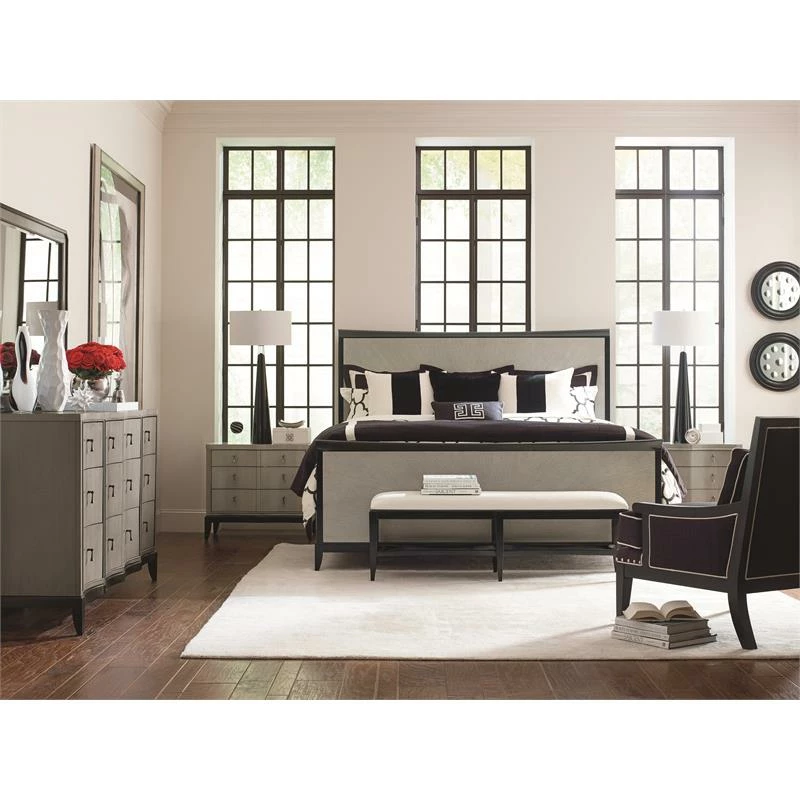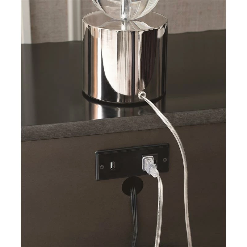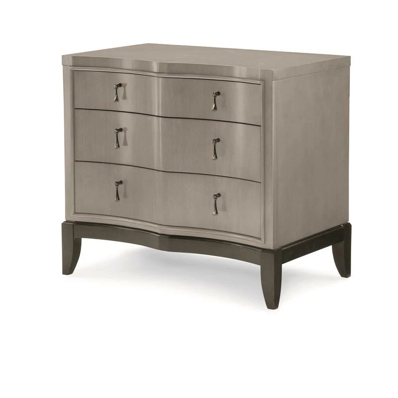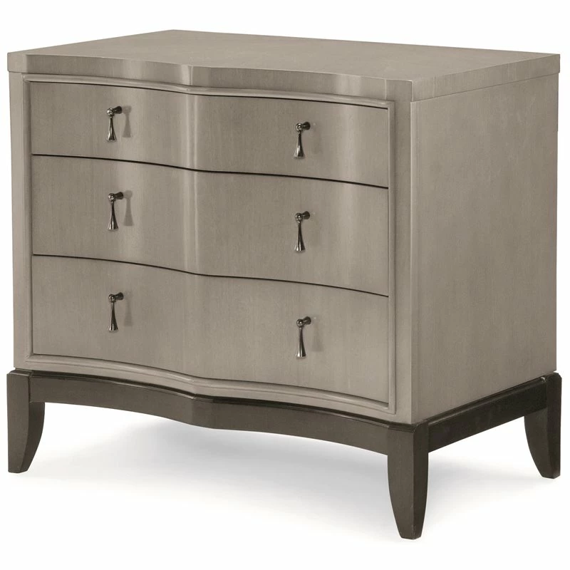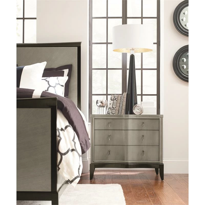 The Symphony 3 drawer night stand is a perfect composition of form and finish. Three drawers provide room for all your bedtime routine necessities while the outlet and USB port keep your devices fully charged and connected. The elegance of Symphony is encapsulated in the two-tone Platinum Gray finished body with an Onyx Black Tie base and custom jewelry-like hardware. The sinuous shapes of each piece are emphasized by the scalloped wave front and mitered fan veneer pattern. Crafted of Hardwood Solids and Linden Tech Veneers in a Platinum or Black-Tie finish with Onyx Hardware.