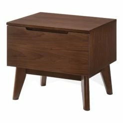 The smooth Walnut Veneer finish of this Limari Home Lewis Mid-Century Modern Walnut Nightstand makes it an eye-stealer. Furnished with a single cavernous drawer, it features wood markings on the surface and a rectangular hollowed area on the upper portion of the drawer that functions as drawer pull. Walnut finished solid Rubberwood tapered legs keep this modern nightstand standing on the floor.