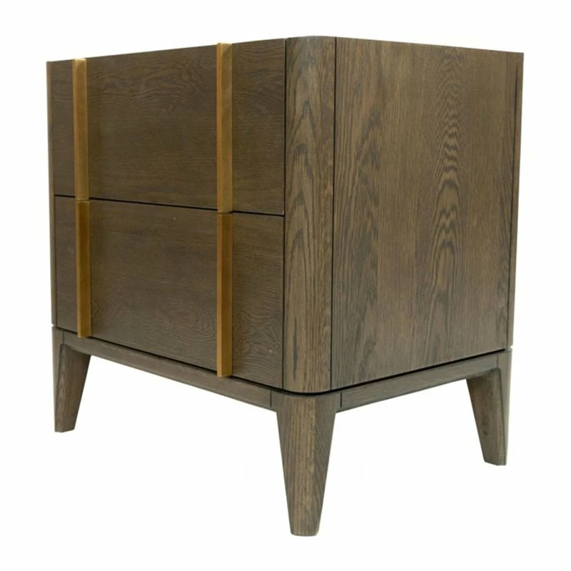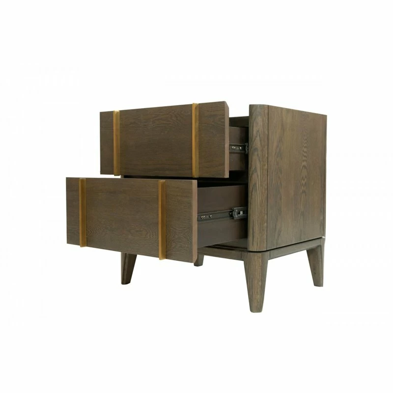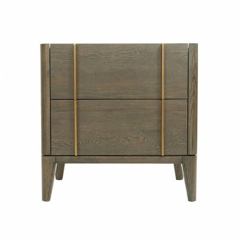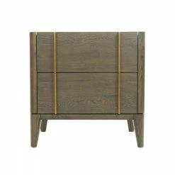 The Oakley Nightstand is the perfect pair of deep wood and metal accents. The tapered legs and deep oak veneer lend themselves to a mid-century design that is timeless. Two gold metal strips create visual interest with a glam flair. Create a stimulating, modern room by pairing this slatted bed with the matching Bed, Dresser, Chest, and Mirror.