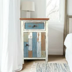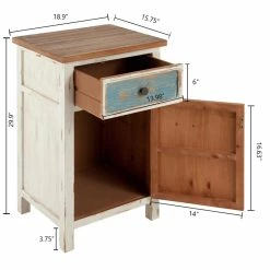 Elevate the art of rustic farmhouse living with this charming multi-color end table with distressed finishes and natural wood accents. From bedside to chairside, you will find this side table provides multiple functions. The table includes a single door cabinet with an open space for storing larger items. The top drawer is perfect for storing remotes, devices, and other items to keep on hand. The table is fully assembled, and ready to use right out of the box. Enjoy the rustic charm of the cabinet with its soothing colors, and natural wood finish tabletop perfect for a lamp, or your favorite picture or plant.