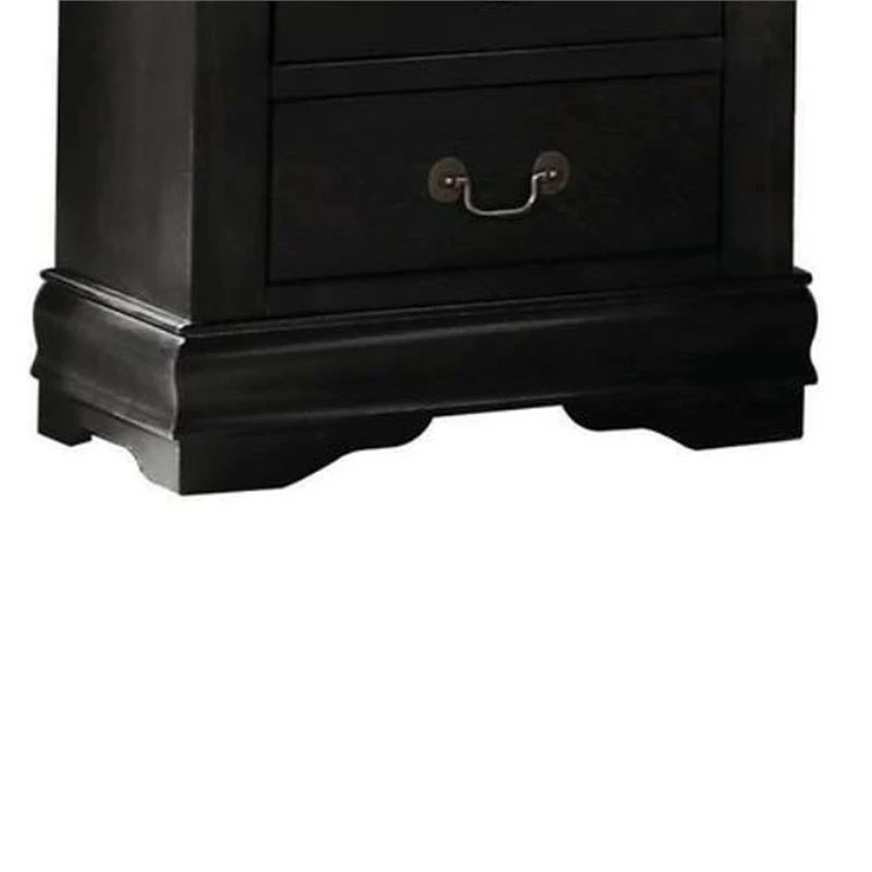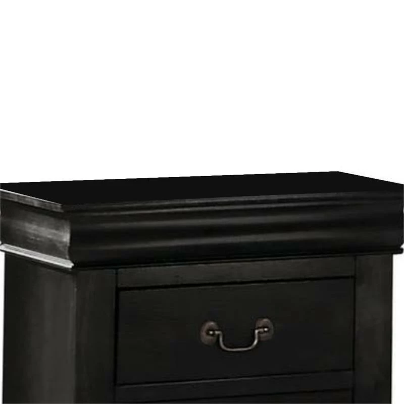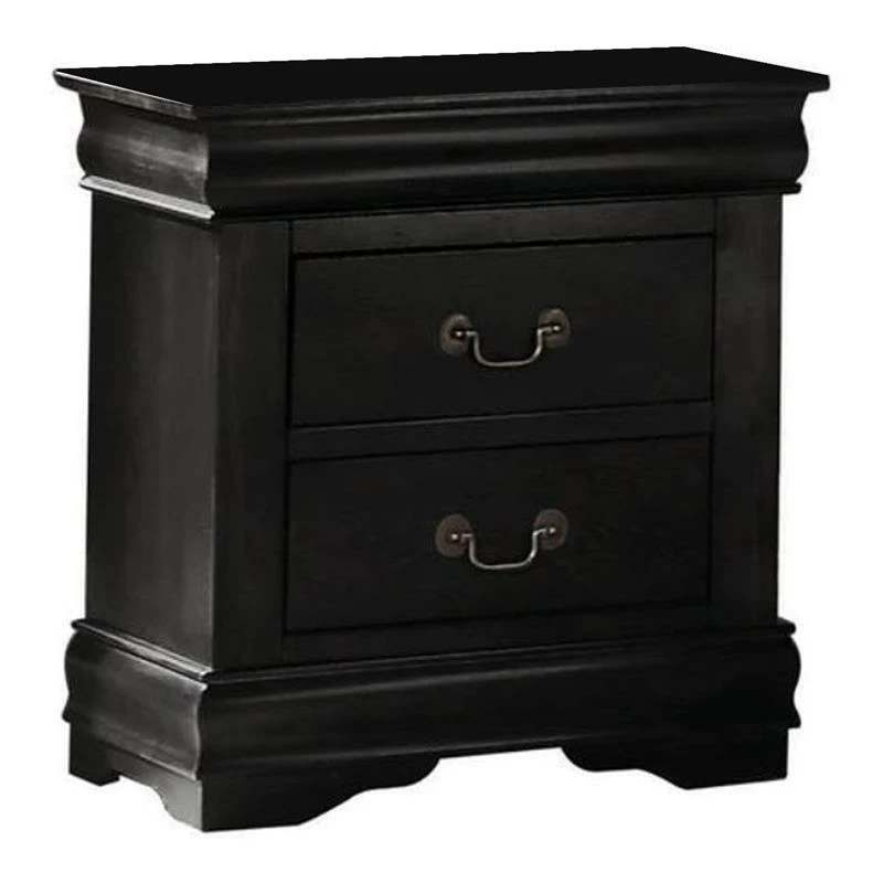 This nightstand’s vintage inspired details add storage with traditional appeal to any bedroom space. Constructed of select veneers and hardwood solids in a black finish, the spacious nightstand offers two drawers for you to store your reading books, reading glasses, and other belongings at an arms length away when you are in bed. Complete with shaped molding, bracket feet, and antique bronze color bail hardware, the nightstand has relaxed yet timeless style. Note: other featured items in image except this nightstand are sold separately.