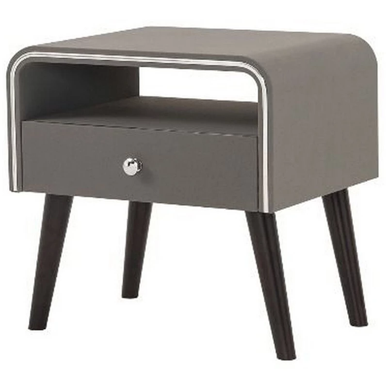 Add a contemporary flair to your home with this nightstand featuring sturdy wooden construction. Supported on splayed legs, it features 1 drawer and open compartment that offer spacious storage and complemented with chrome trim inlay at the curved edges to enhances its overall look.