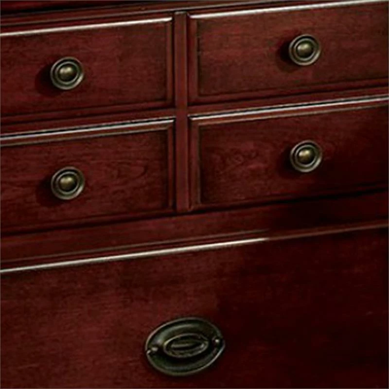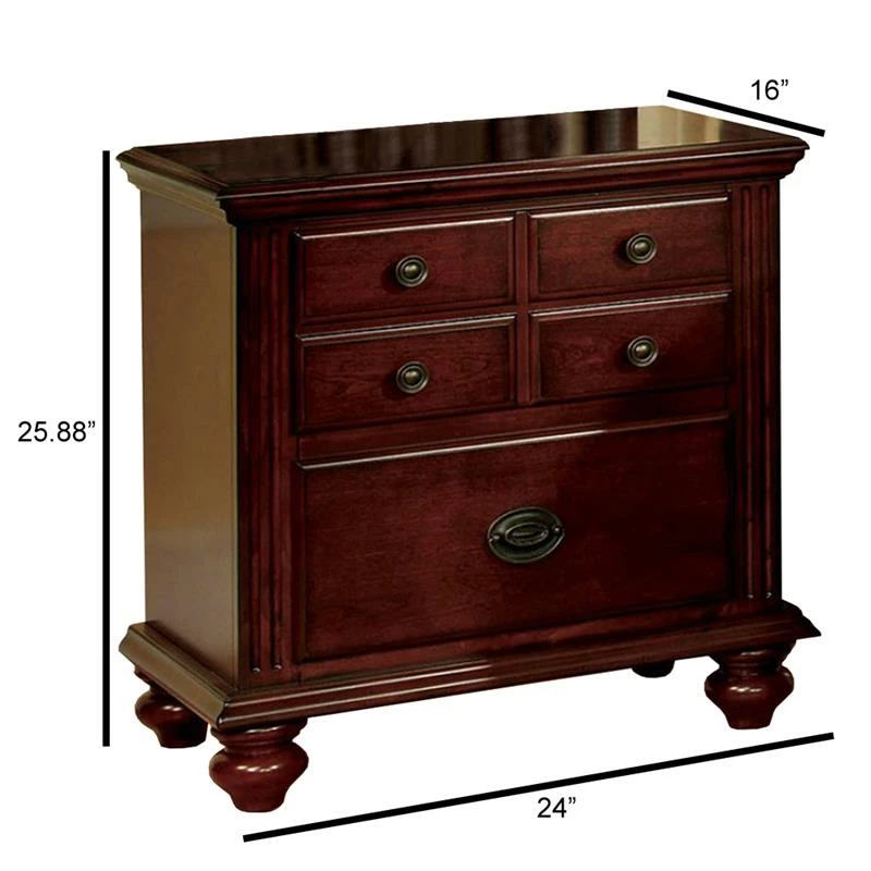 Elegant european styling delivers a timeless look and graceful design to this transitional style nightstand. Antique gold knobs adorn the exterior while a rich cherry finish completes the overall appearance.