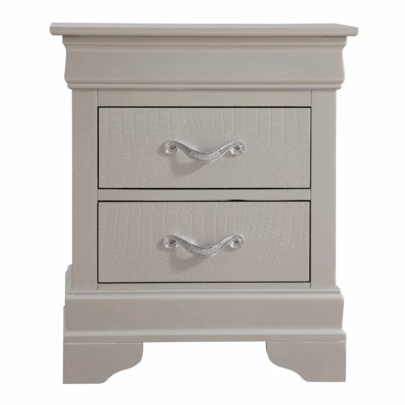 Assembled 2 drawer nightstand is finished in real wood veneers over manufactured and solid wood. Drawers move on center supported metal guides and are dovetailed front and back. Corner blocks are utilized to support drawer bottoms. Additonal case pieces are available as well as matching beds