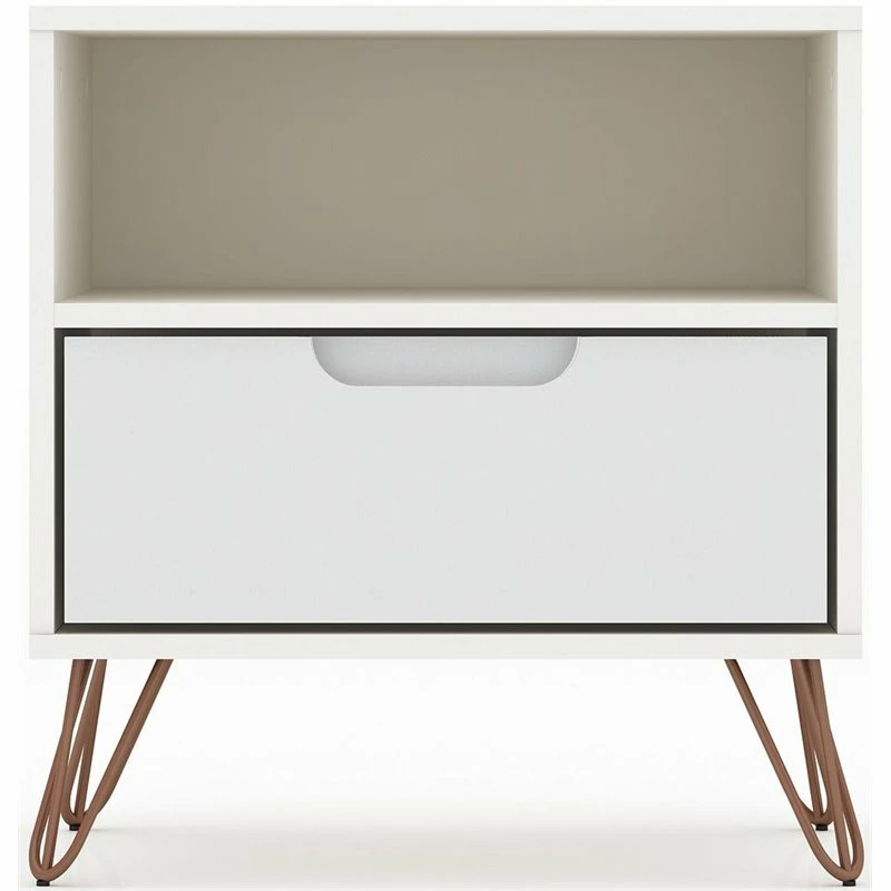 Moonlighting as an end table or armchair sidekick, the Rockefeller nightstand is seamless and sophisticated, with plenty of Mid-century flair, enhanced by edgy metal splayed legs, cutout drawer handles, and clean lines, to feature one sophisticated design. Tuck away remotes, books, tablets, and more, in the concealed drawer space, and keep magazines, laptops, or books, in the open shelf space for easy access. Add a decorative lamp and favorite framed photos on its base and set it in the living room or bedroom to finish off the space.