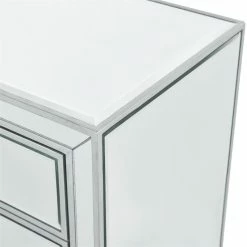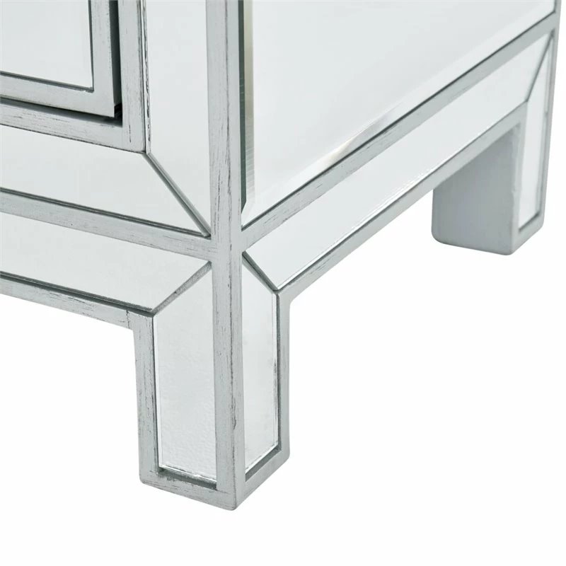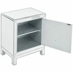 With its sleek lines and contemporary reflective appeal, this cabinet brings elegance and glamour. It provide ample storage space with strong shelving, jewel like crystal knobs, top quality mirror surfaces, and distinctive mitered corners. It combines function and style for any room in your home.