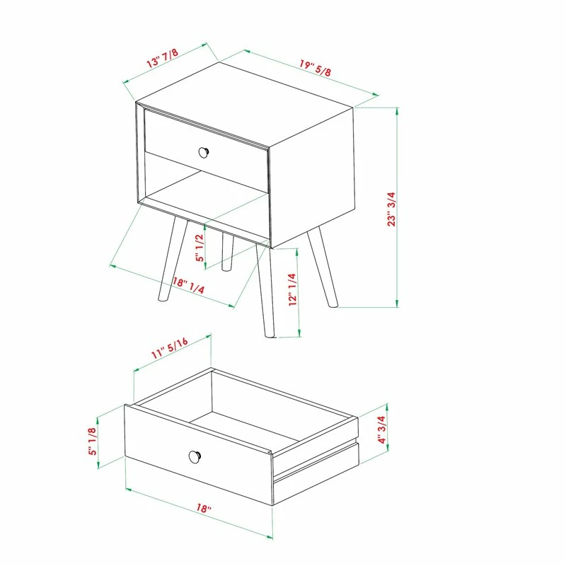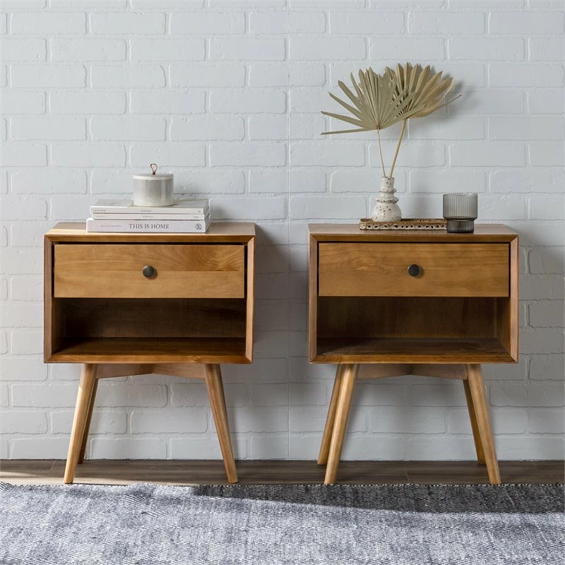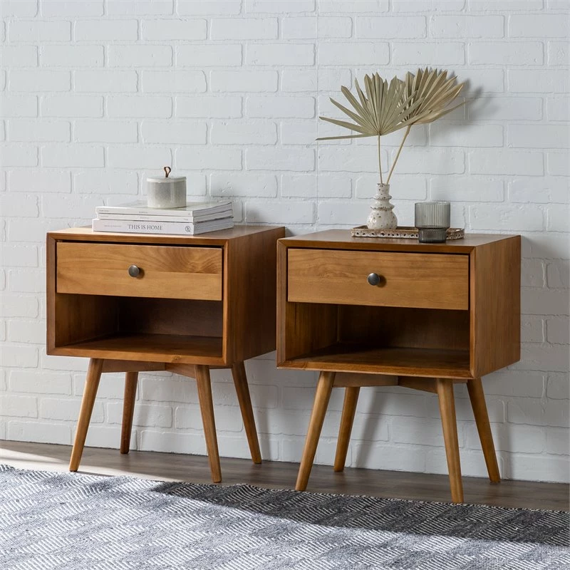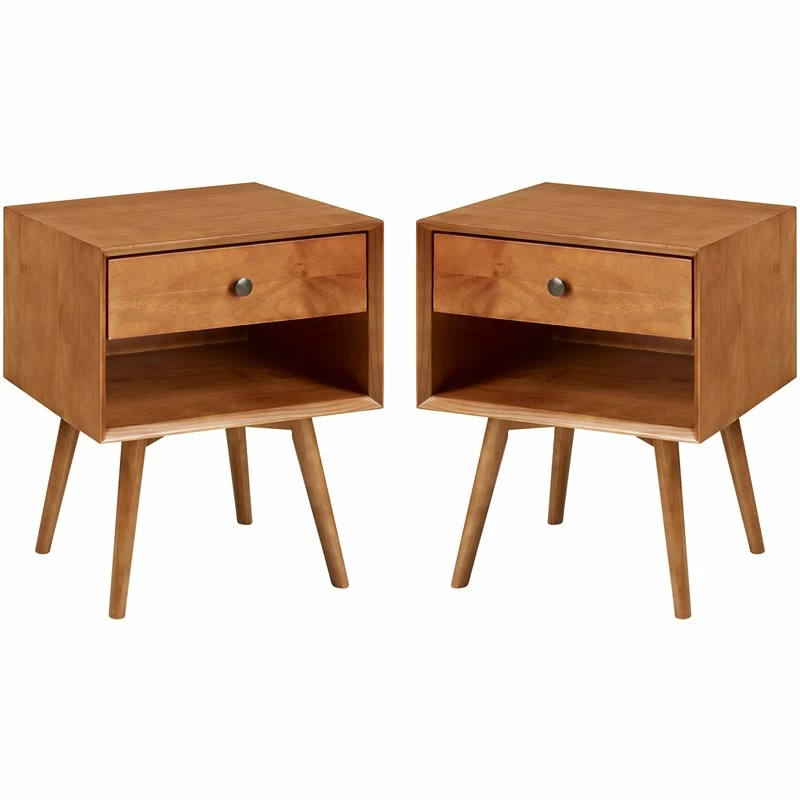 Eco-friendly meets mid-century modern with this solid pine wood, single drawer nightstand. Its wood frame is responsibly harvested from renewable forests so feel great about indulging in a little, treat-yourself treasure. Beveled front edges, sleek tapered legs, and a photo-ready laminate finish produce a lovely, modern silhouette. A lower cubby is available to hold all your home goods and décor. Place this end table in a living room, bedroom, or dining room and play with its versatile model. Today it’s a nightstand, but tomorrow it’s a side table or accent table. And if one of these eco-friendly beauties isn’t enough add another for a framing look or add to your Earth friendly purchase with the two-drawer nightstand.