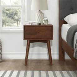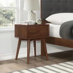 Bedroom furniture accessories complete with Mid-Century Modern furniture style Pemberly Row Nightstand. These bedside tables in constructed solid and walnut brown color. As a storage cabinet side table and night stand an eye-catcher for any bedroom or living room. This Vintage Designed Nightstand in brown walnut creates a cozier, elegant living space. Solid wood crafted beveled edges and decorative knobs easy to blend to your living room, attic bedroom, guest room, lounge, study room, office, kids room, game room and etc. Thanks to its classy design and convenience this nightstand can be used as bedroom nightstand set of 2 or a single on the bed side table/night. It is Multifunction End Table, Walnut nightstand with drawers is designed for small spaces. This brown small nightstand also good to work as sofa end table, side table, corner table, file cabinet, extend storage table besides bedroom dresser, console table. Drawer slides open large to provide bedside shelf and organizer and storage table. This compact size modern nightstand can be used in condo, loft, house and apartment bedrooms. Built from durable solid wood shelf frame and the legs guarantee enough stability and safety. Materials are humidity resistant and easy wet wipe cleaning. Product comes as semi assembled; very minimal only feet assembly required.