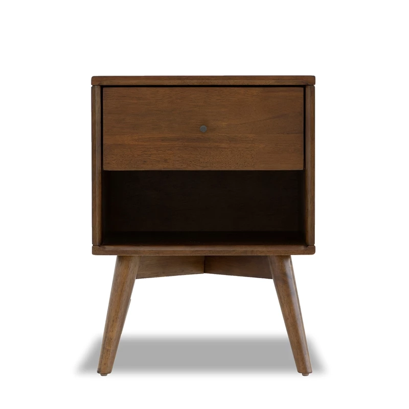 Bedroom furniture accessories complete with Mid-Century Modern furniture style Pemberly Row Nightstand. These bedside tables in constructed solid and walnut brown color. As a storage cabinet side table and night stand an eye-catcher for any bedroom or living room. This Vintage Designed Nightstand in brown walnut creates a cozier, elegant living space. Solid wood crafted beveled edges and decorative knobs easy to blend to your living room, attic bedroom, guest room, lounge, study room, office, kids room, game room and etc. Thanks to its classy design and convenience this nightstand can be used as bedroom nightstand set of 2 or a single on the bed side table/night. It is Multifunction End Table, Walnut nightstand with drawers is designed for small spaces. This brown small nightstand also good to work as sofa end table, side table, corner table, file cabinet, extend storage table besides bedroom dresser, console table. Drawer slides open large to provide bedside shelf and organizer and storage table. This compact size modern nightstand can be used in condo, loft, house and apartment bedrooms. Built from durable solid wood shelf frame and the legs guarantee enough stability and safety. Materials are humidity resistant and easy wet wipe cleaning. Product comes as semi assembled; very minimal only feet assembly required.