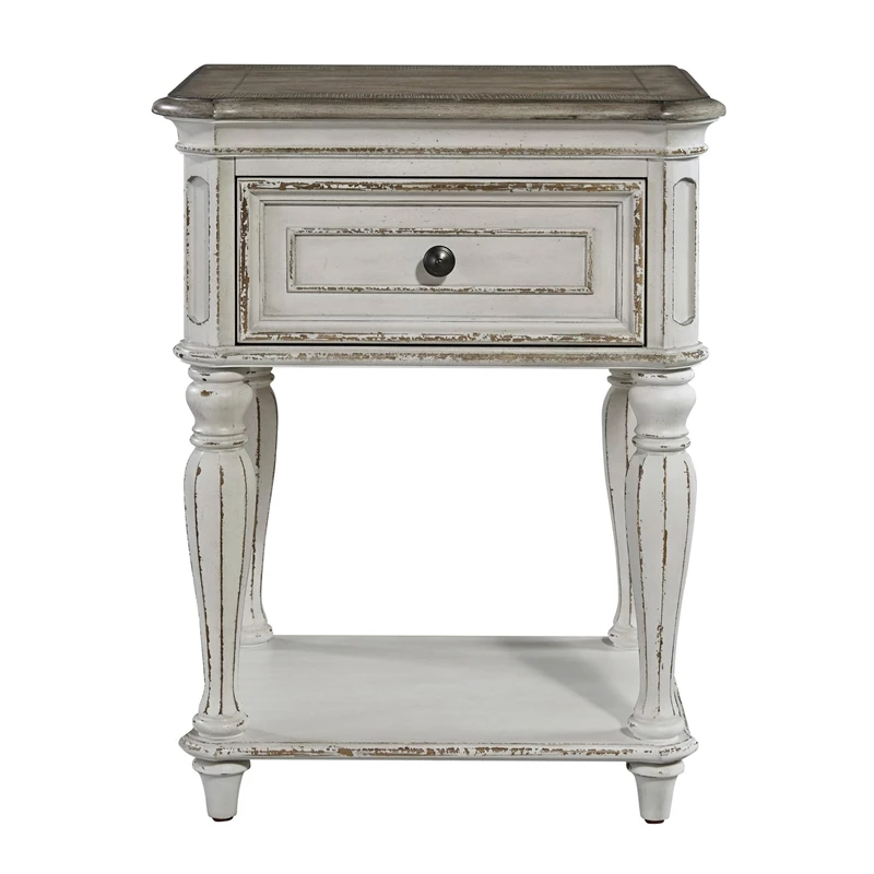 Blending of European influences makes this nightstand a truly unique style for any living space. Warm antique finishes and artistic distressing along with grand scale a group to be passed to generations.