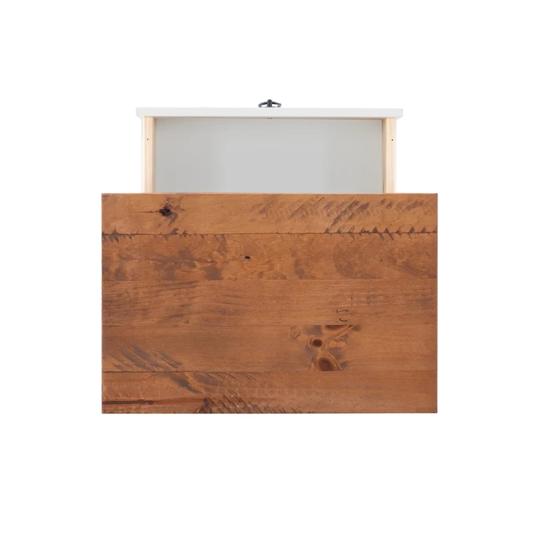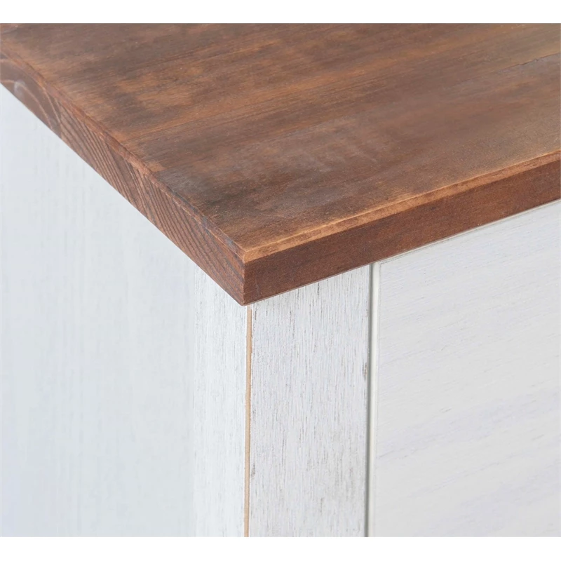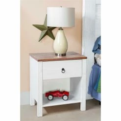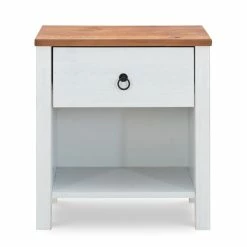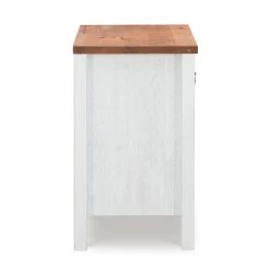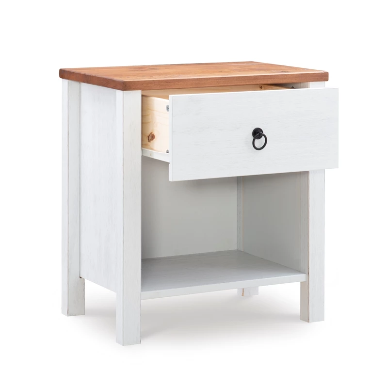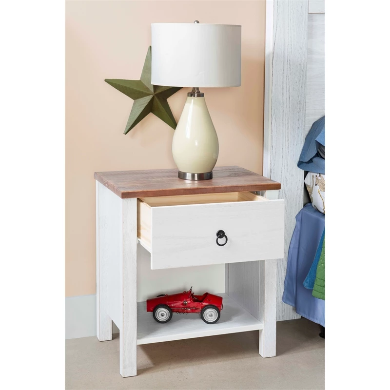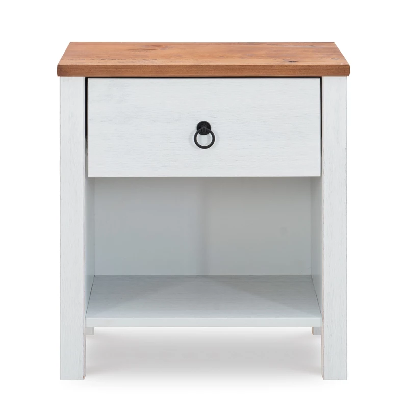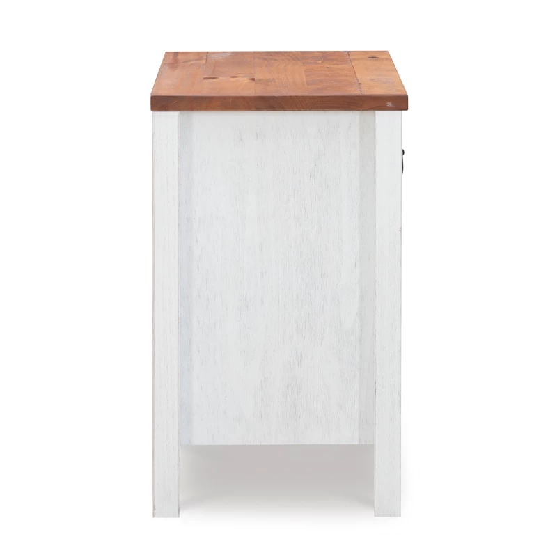 Refresh your bedroom with this classic nightstand featuring clean lines and a two-tone finish. Constructed of solid Elliotis Pine, this durable nightstand brightens any room with the contrast created between the distressed white and rustic oak finishes. Add this piece to your existing set or pair it with the matching headboard and storage pieces to create a bedroom set that meets your needs in charming, farmhouse style.