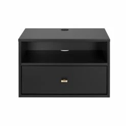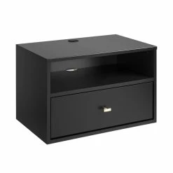 This Prepac Black Floating Nightstand With Open Shelf is the ideal companion for your modern bedroom. With both a drawer and an open compartment, it holds all your typical bedside essentials like books, magazines and glasses. For your electronic devices, both the top surface and the compartment have openings to manage cords. The hanging design gives you the flexibility to place it at any height and saves valuable floor space. Prepac’s innovative mounting rail makes it easy to put up – you just have to find the wall studs. Constructed from CARB 2 compliant, laminated engineered wood. Ships Ready to Assemble, includes an instruction booklet for easy assembly.